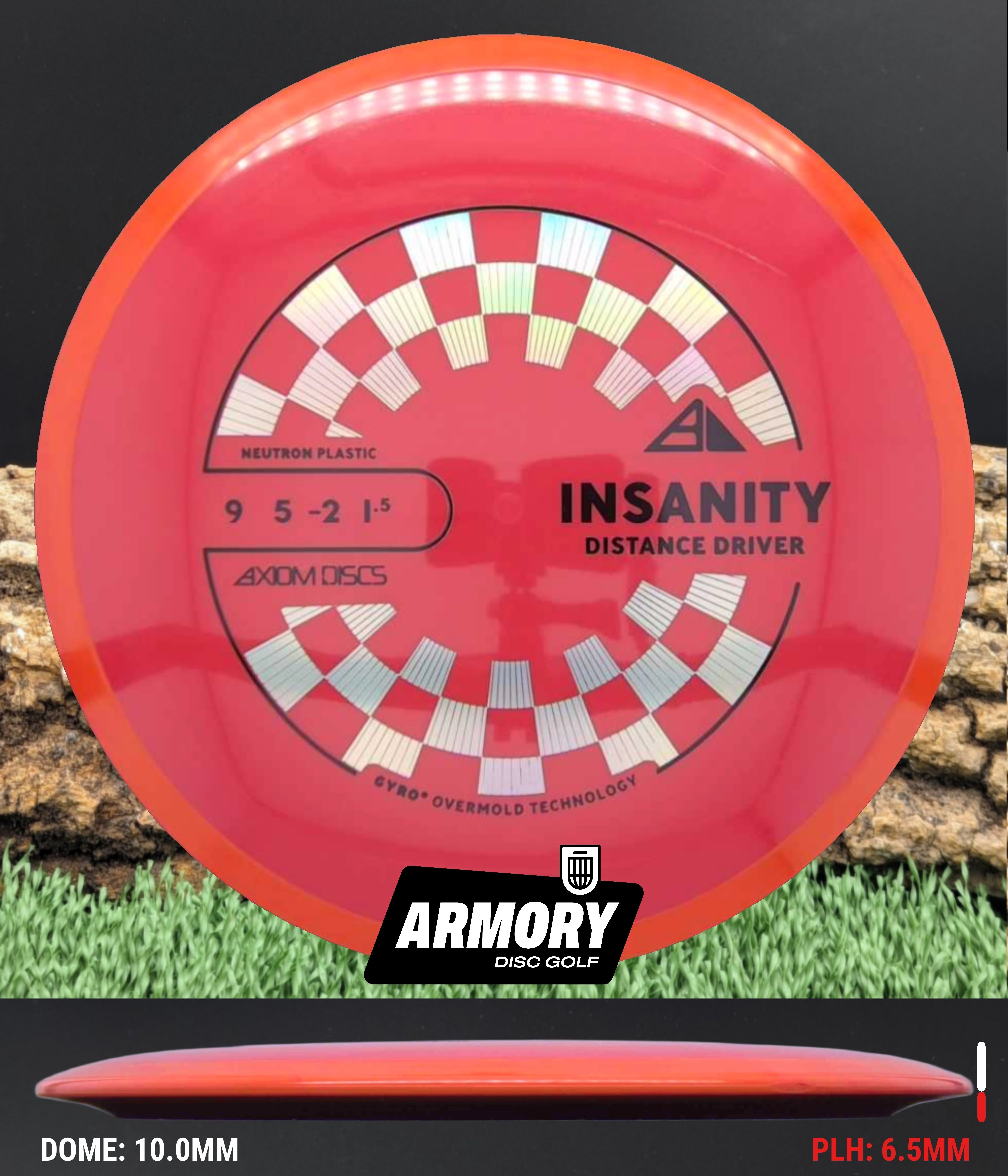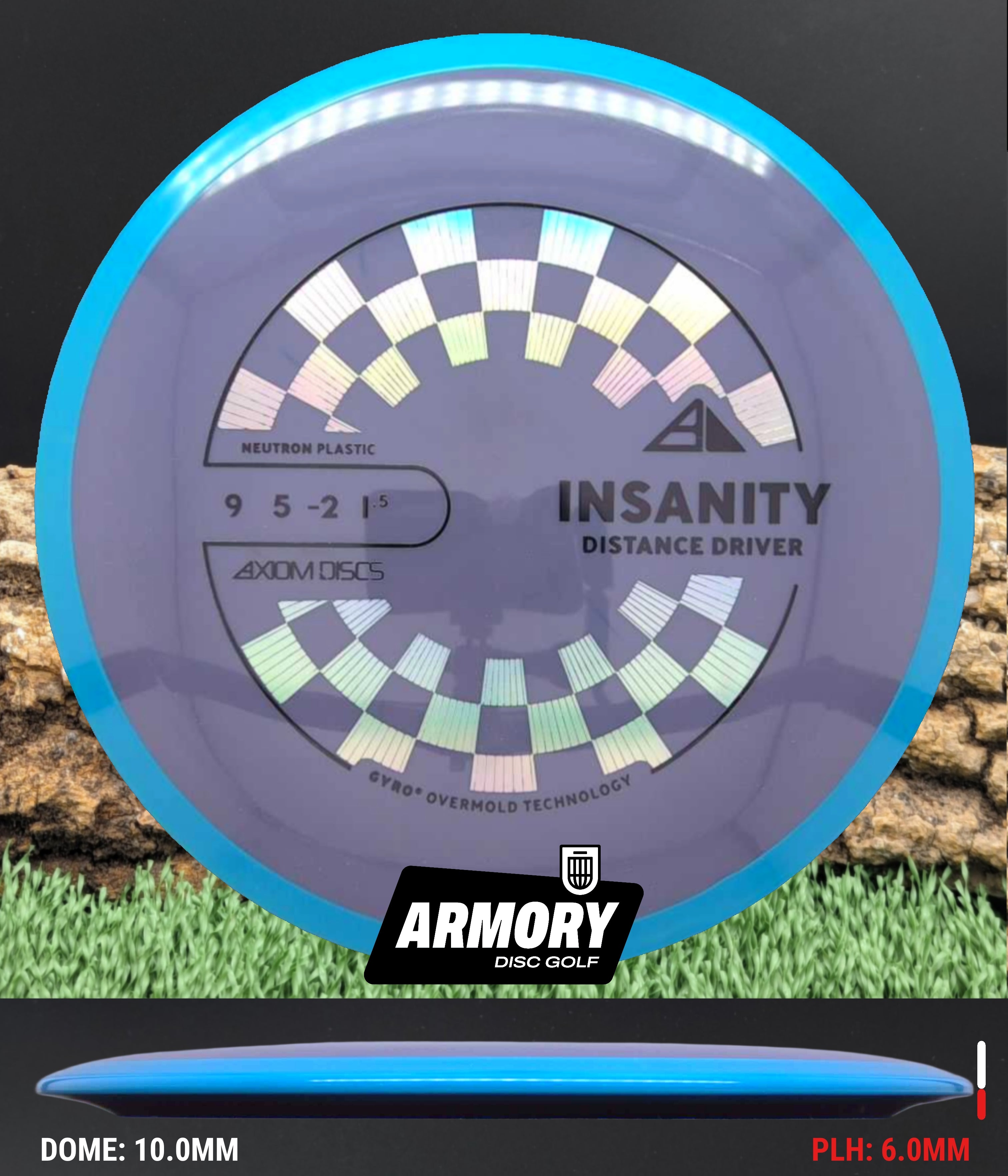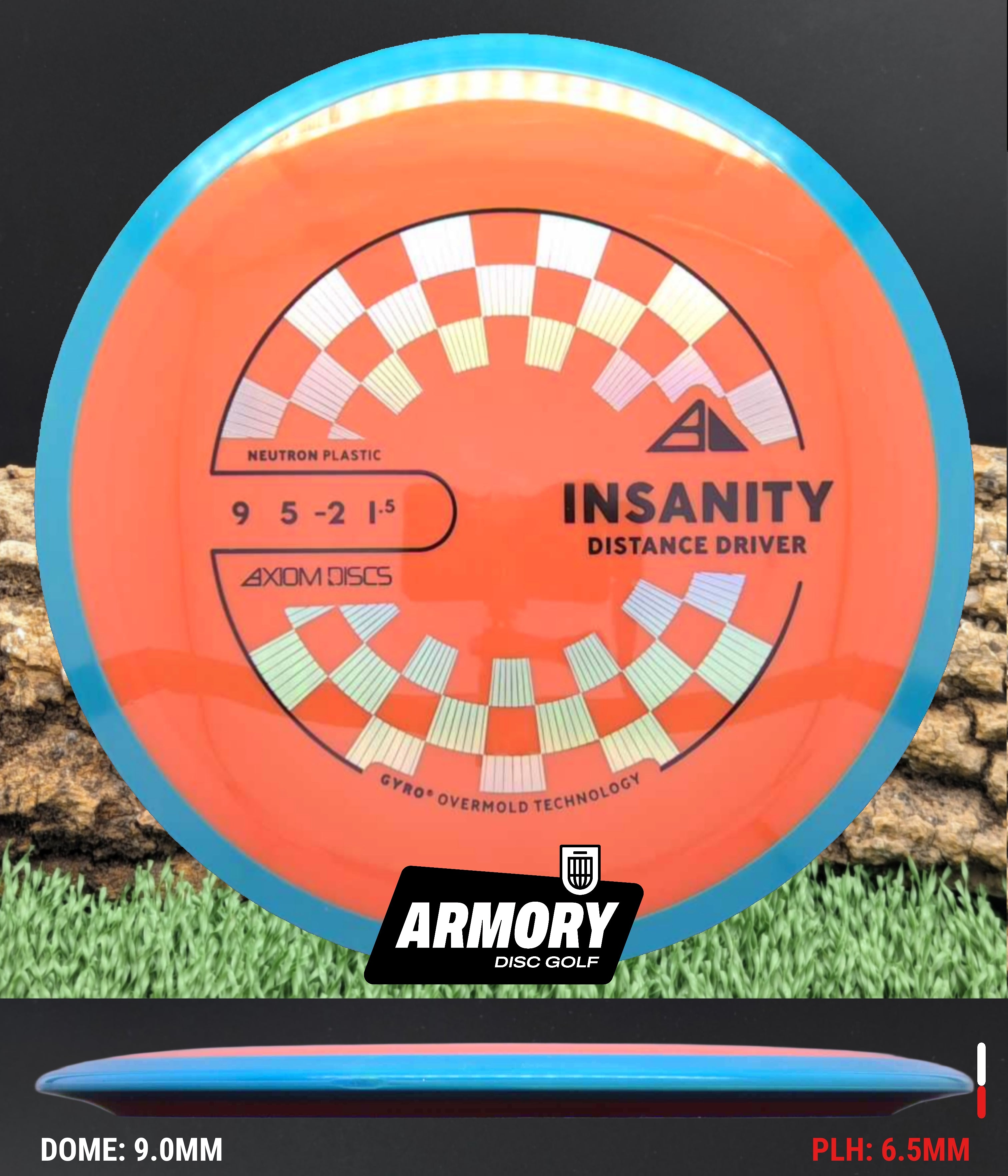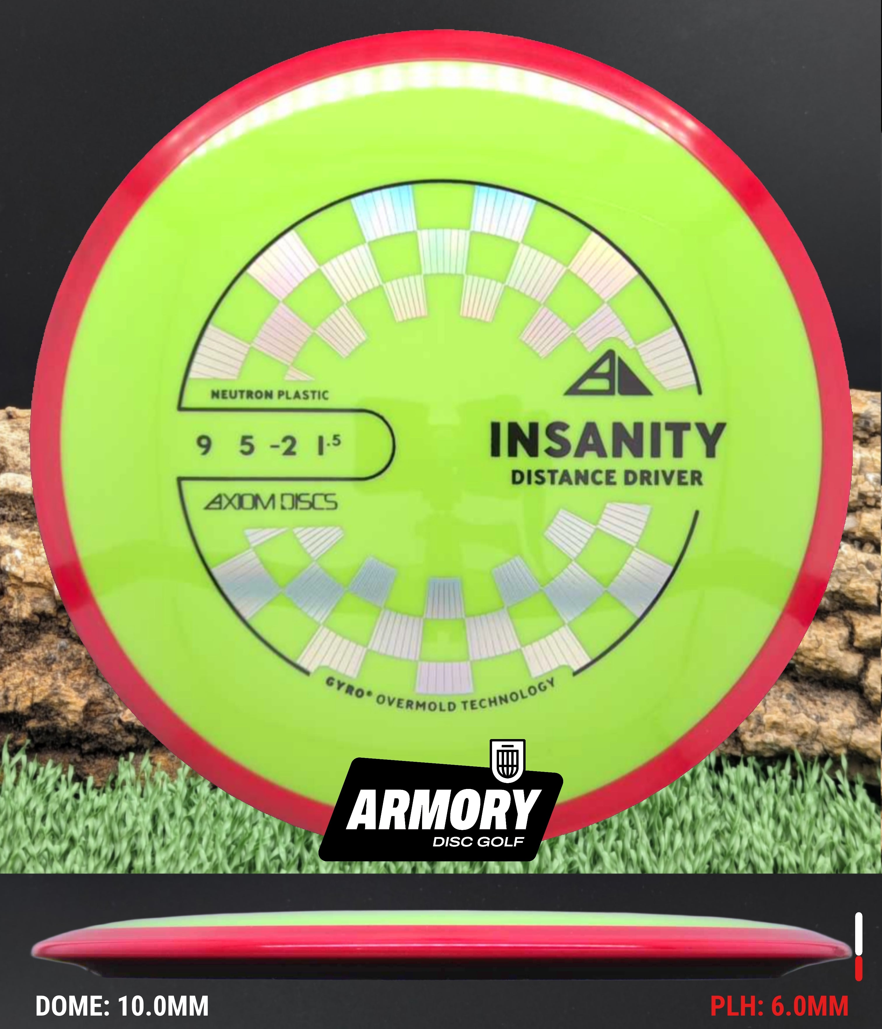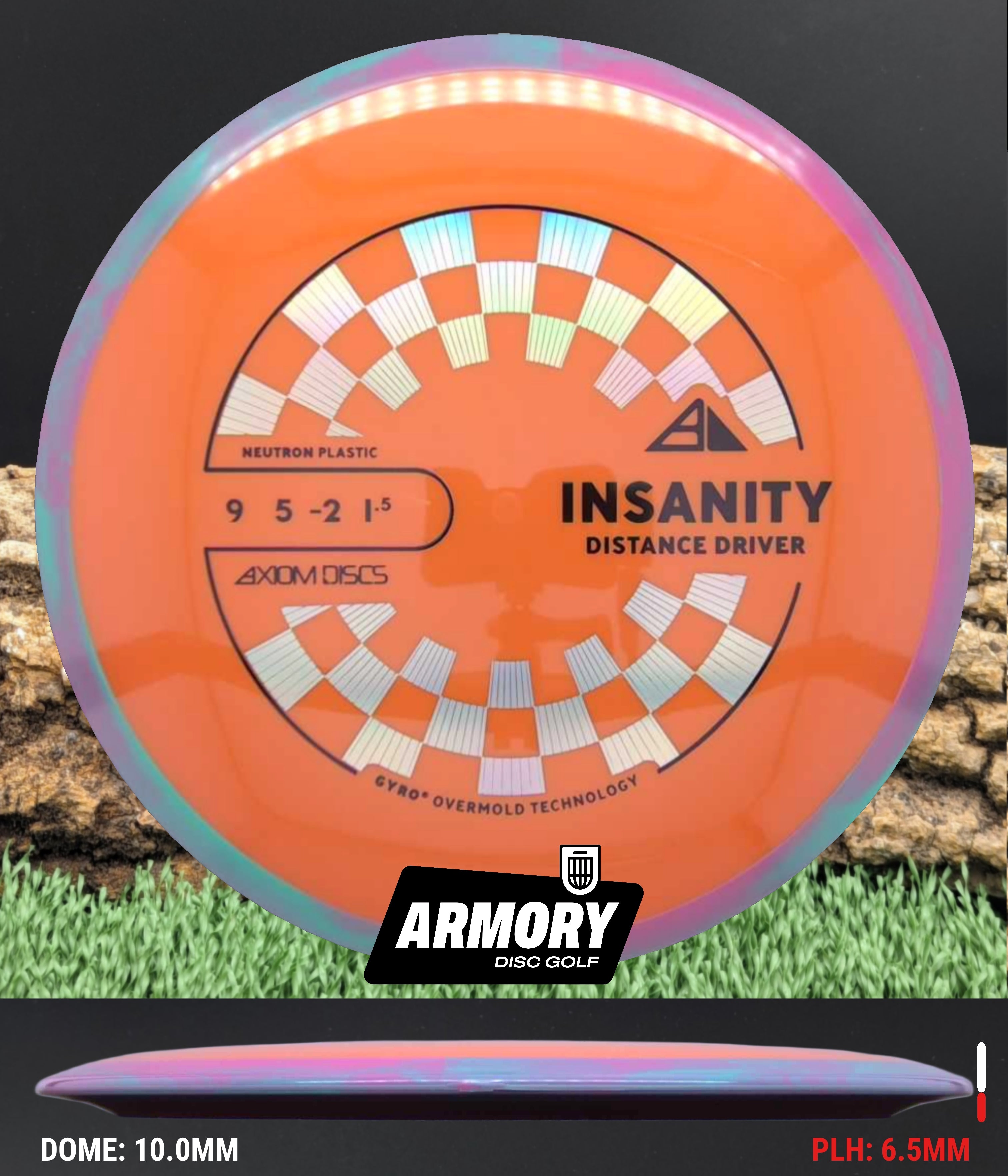 Neutron plastic provides a premium grip and clean release with excellent durability, helping the Insanity maintain its flight characteristics round after round. Its comfortable 18.5 mm rim and GYRO overmold design give players added stability, longer glide, and a dependable finish that makes the Insanity one of Axiom’s most popular fairway drivers.