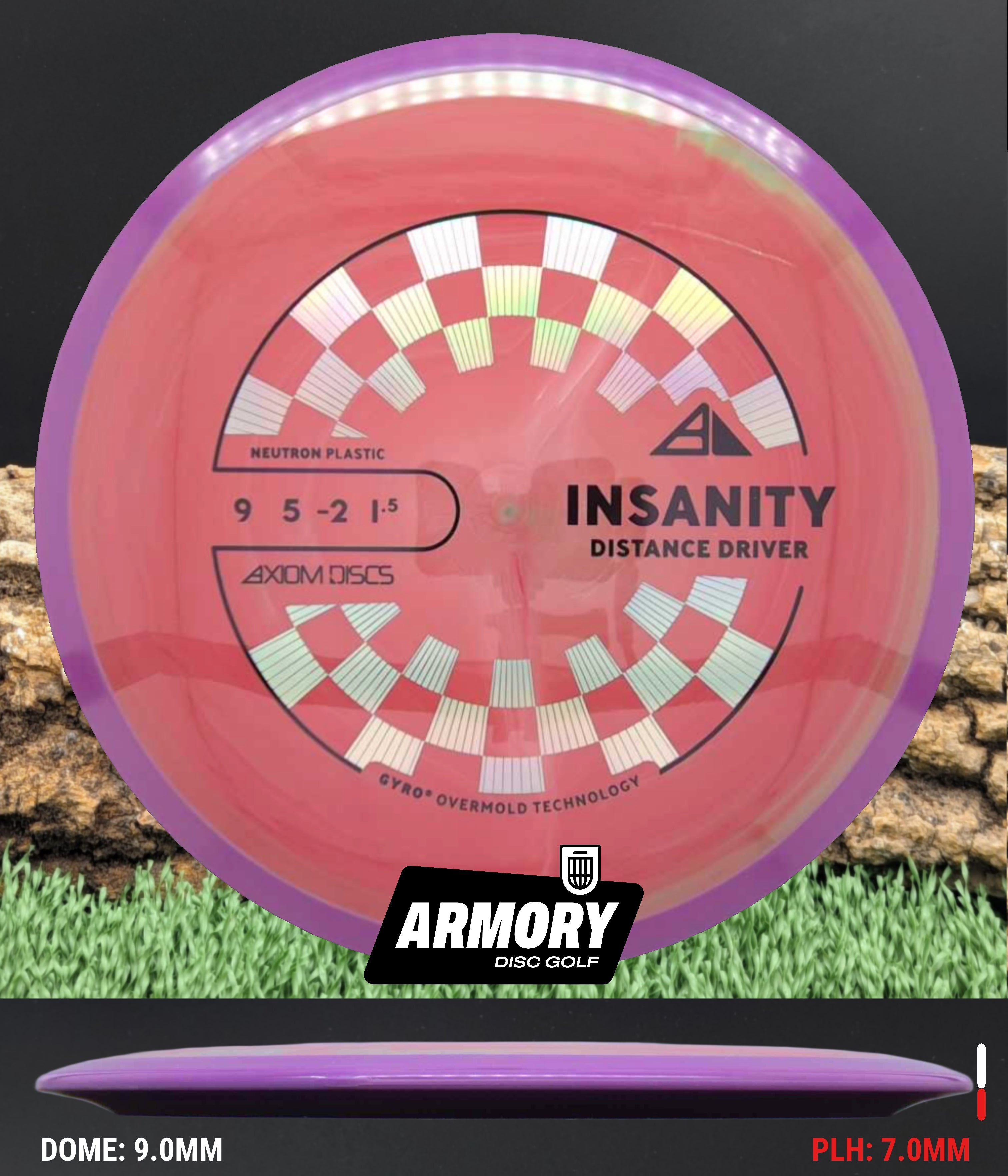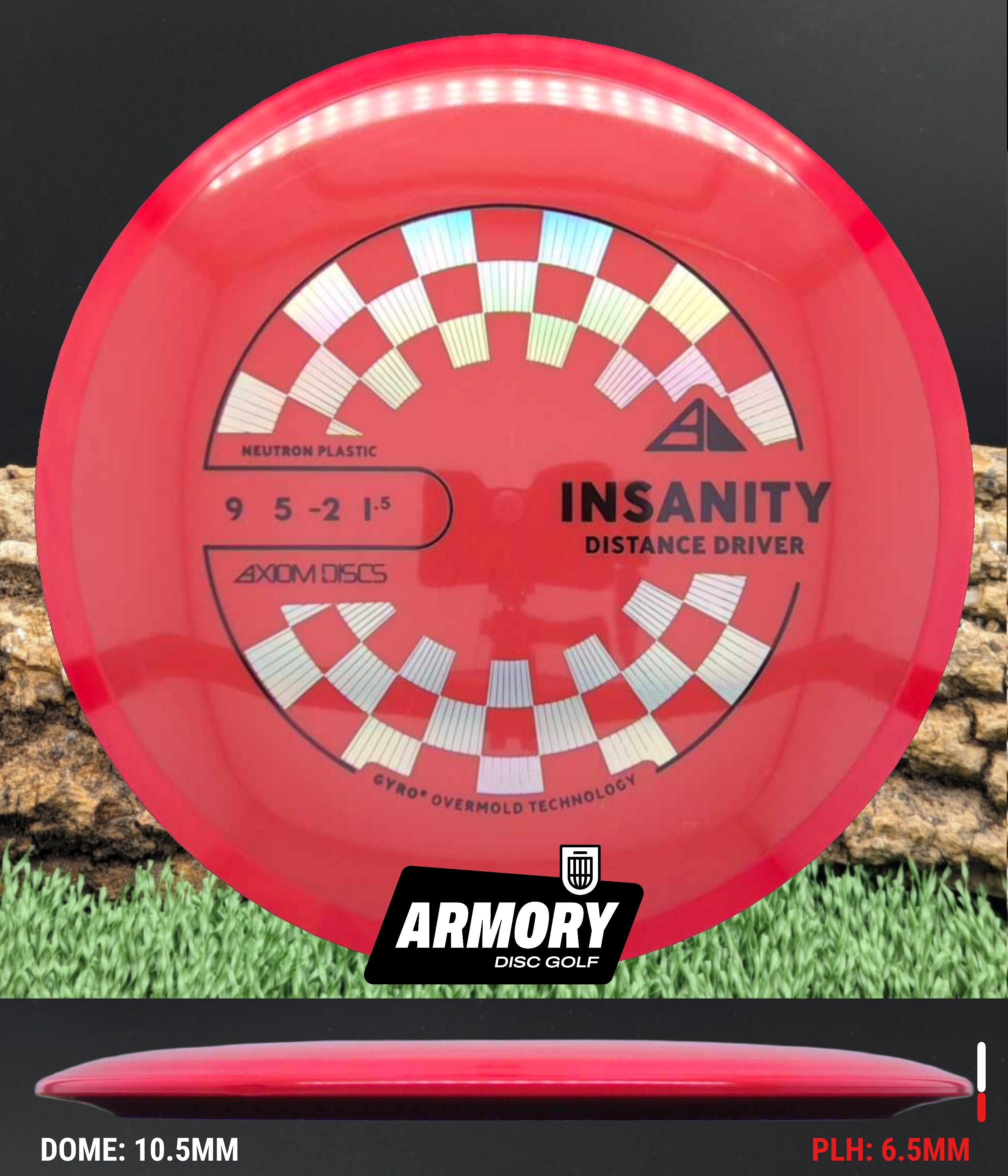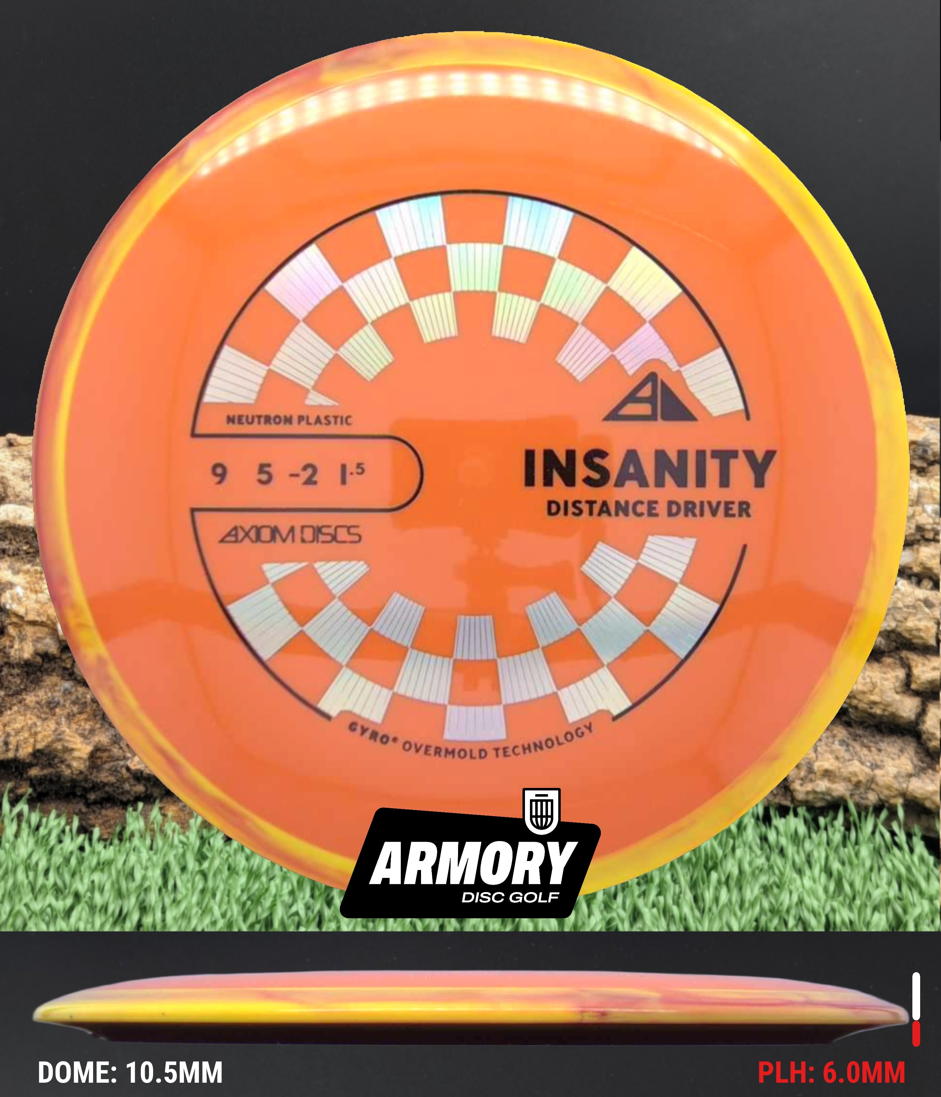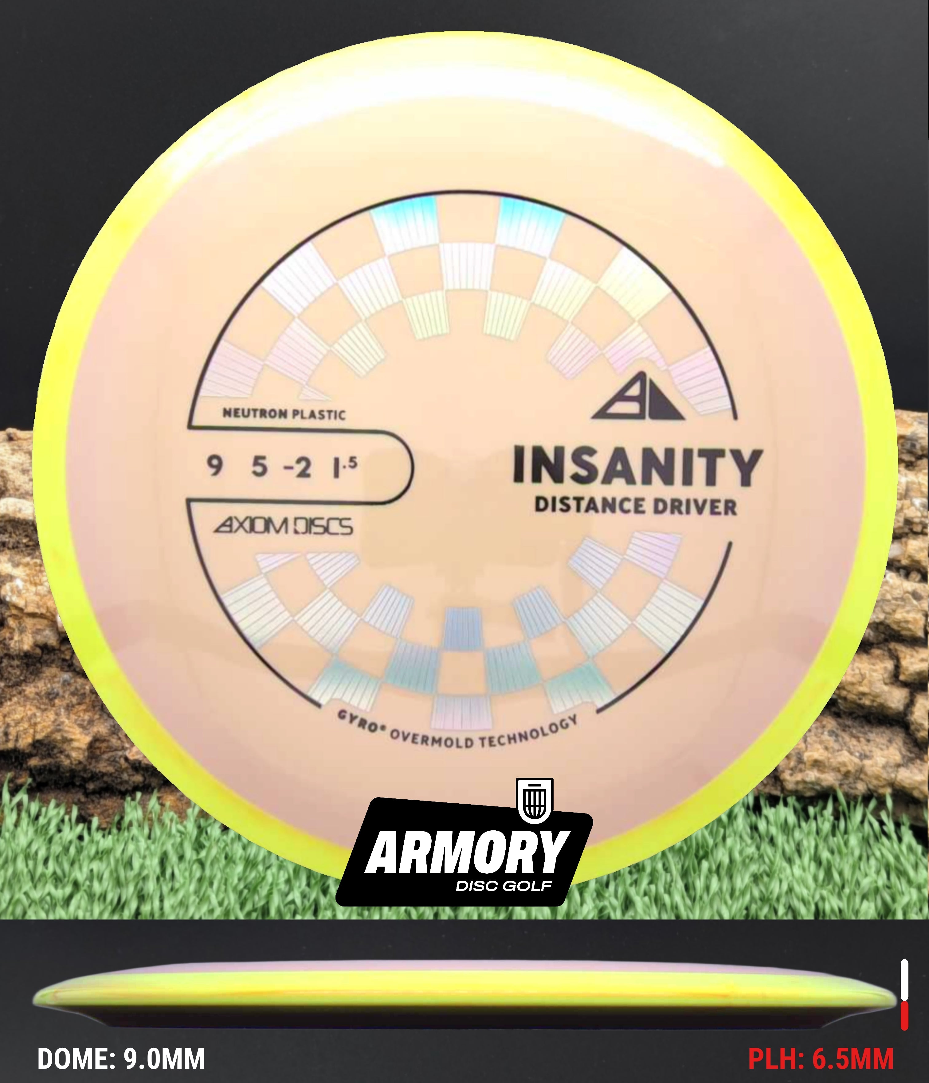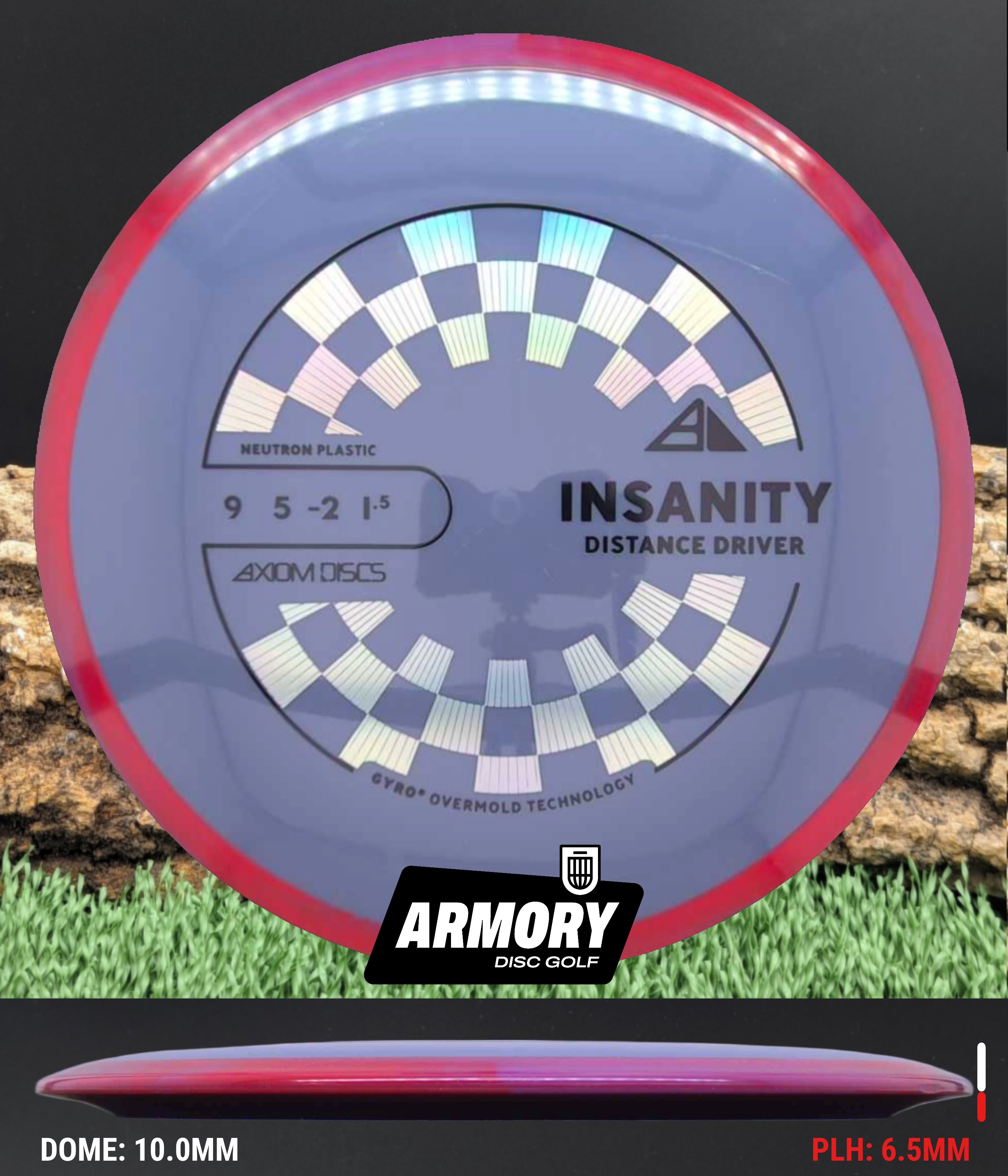 Neutron plastic provides a premium grip and clean release with excellent durability, helping the Insanity maintain its flight characteristics round after round. Its comfortable 18.5 mm rim and GYRO overmold design give players added stability, longer glide, and a dependable finish that makes the Insanity one of Axiom’s most popular fairway drivers.