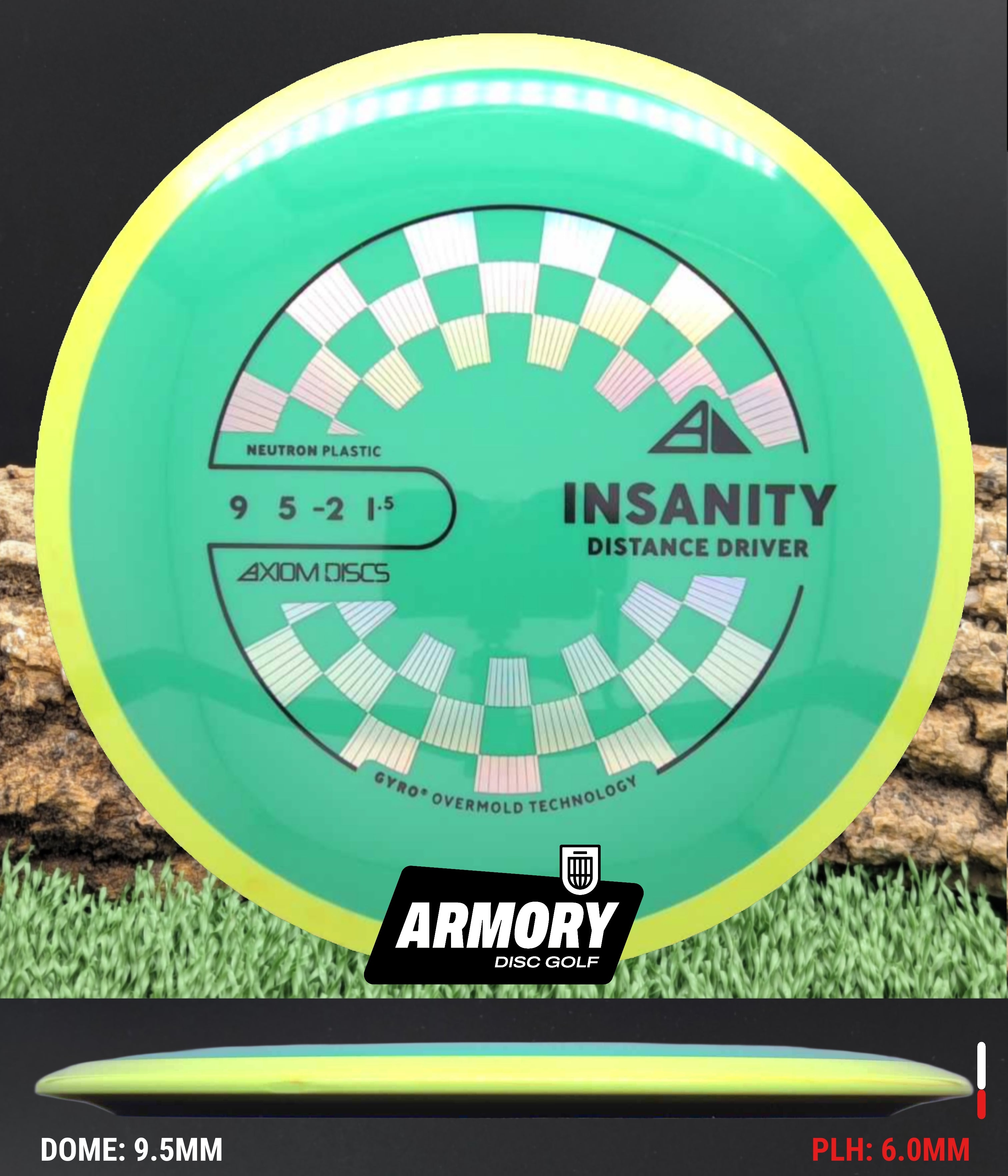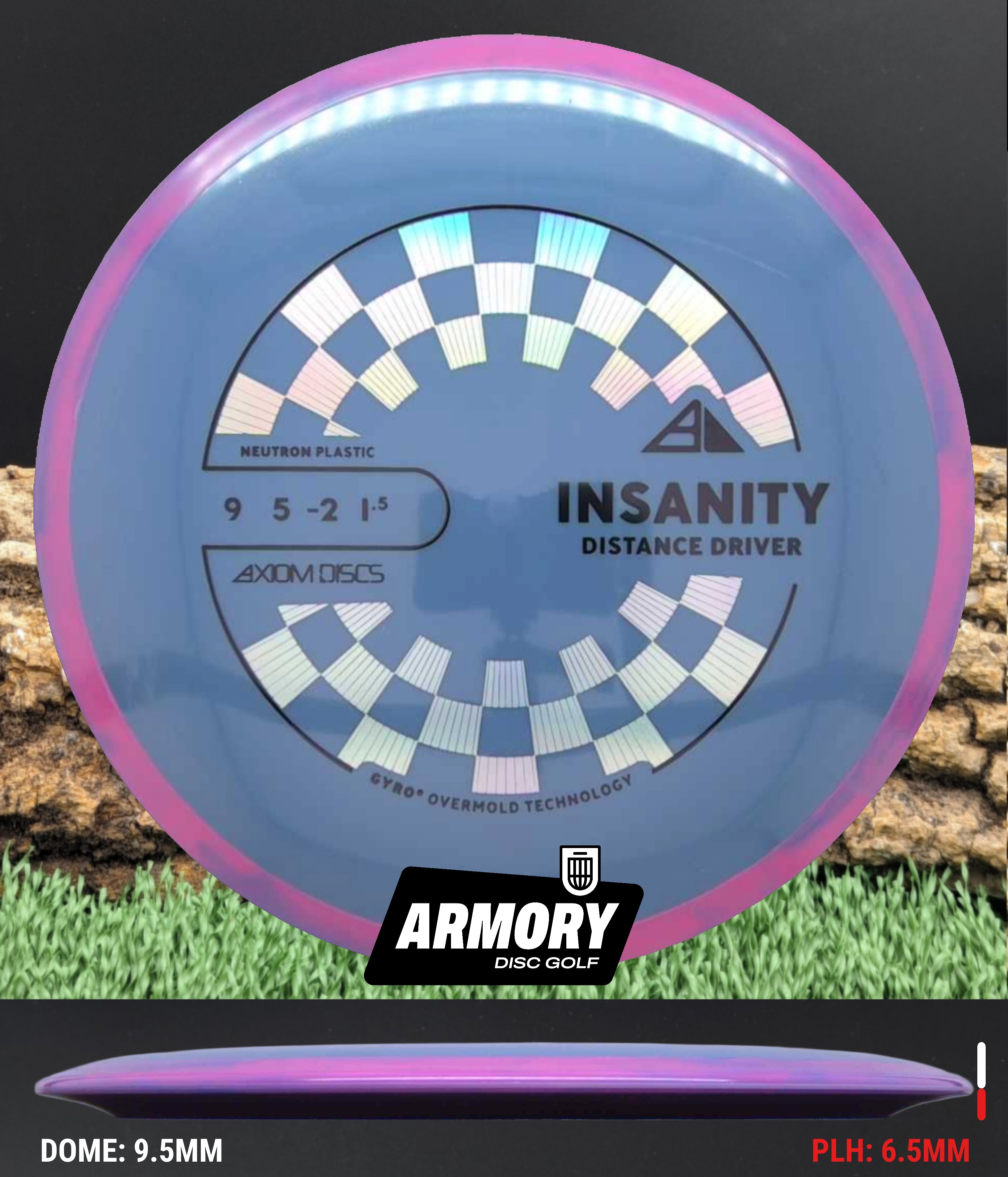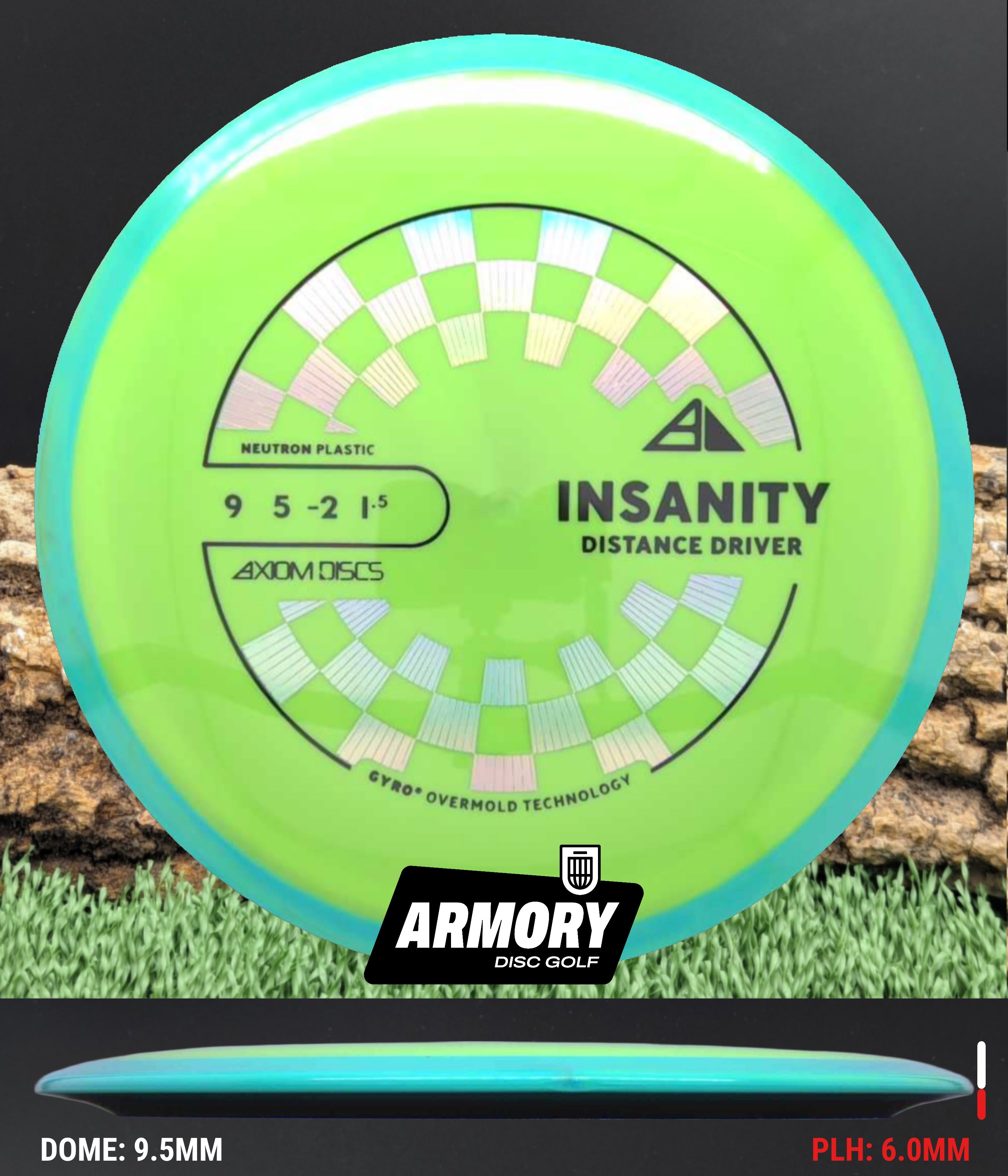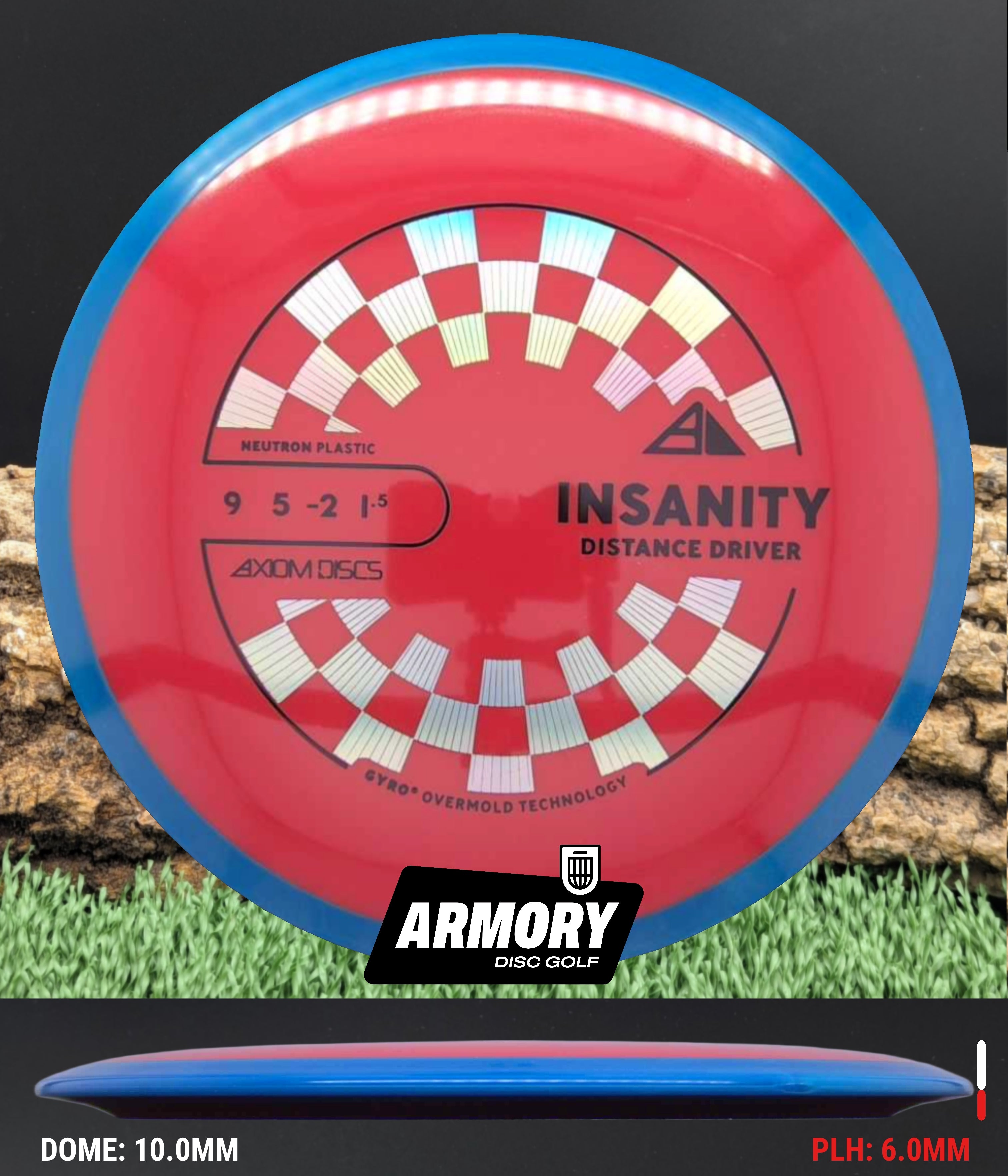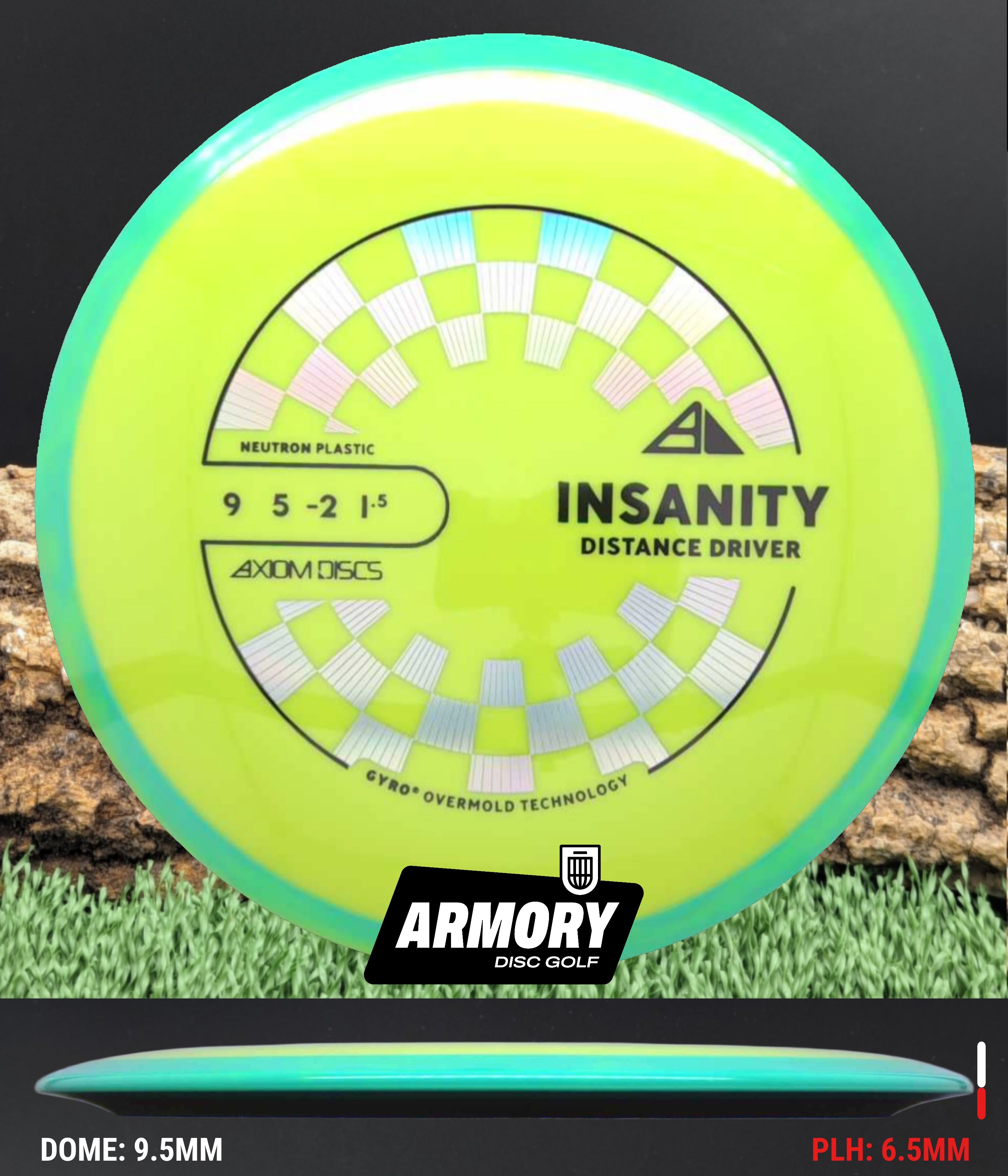 Neutron plastic provides a premium grip and clean release with excellent durability, helping the Insanity maintain its flight characteristics round after round. Its comfortable 18.5 mm rim and GYRO overmold design give players added stability, longer glide, and a dependable finish that makes the Insanity one of Axiom’s most popular fairway drivers.
