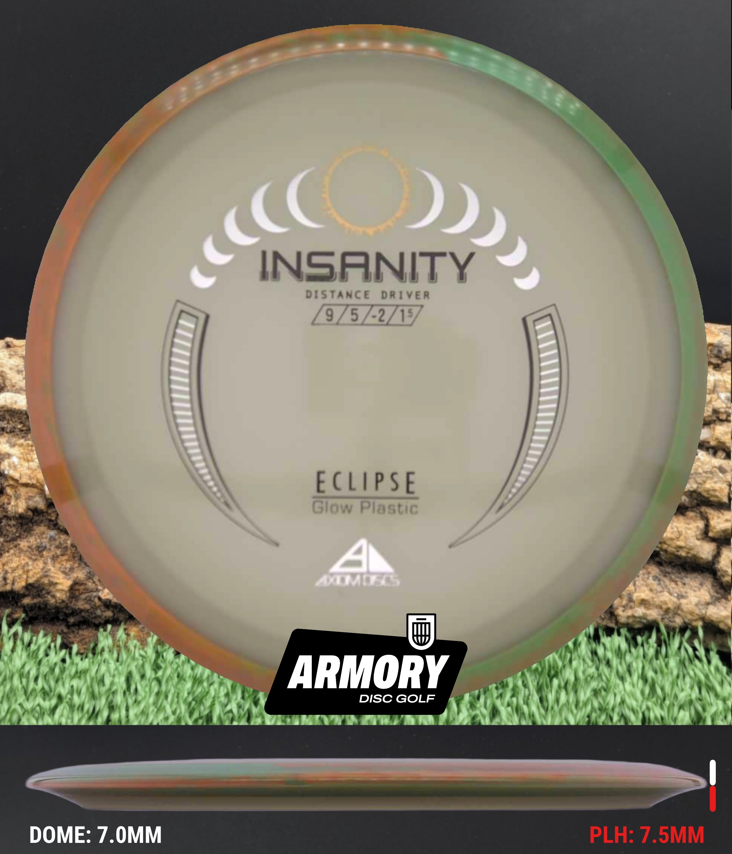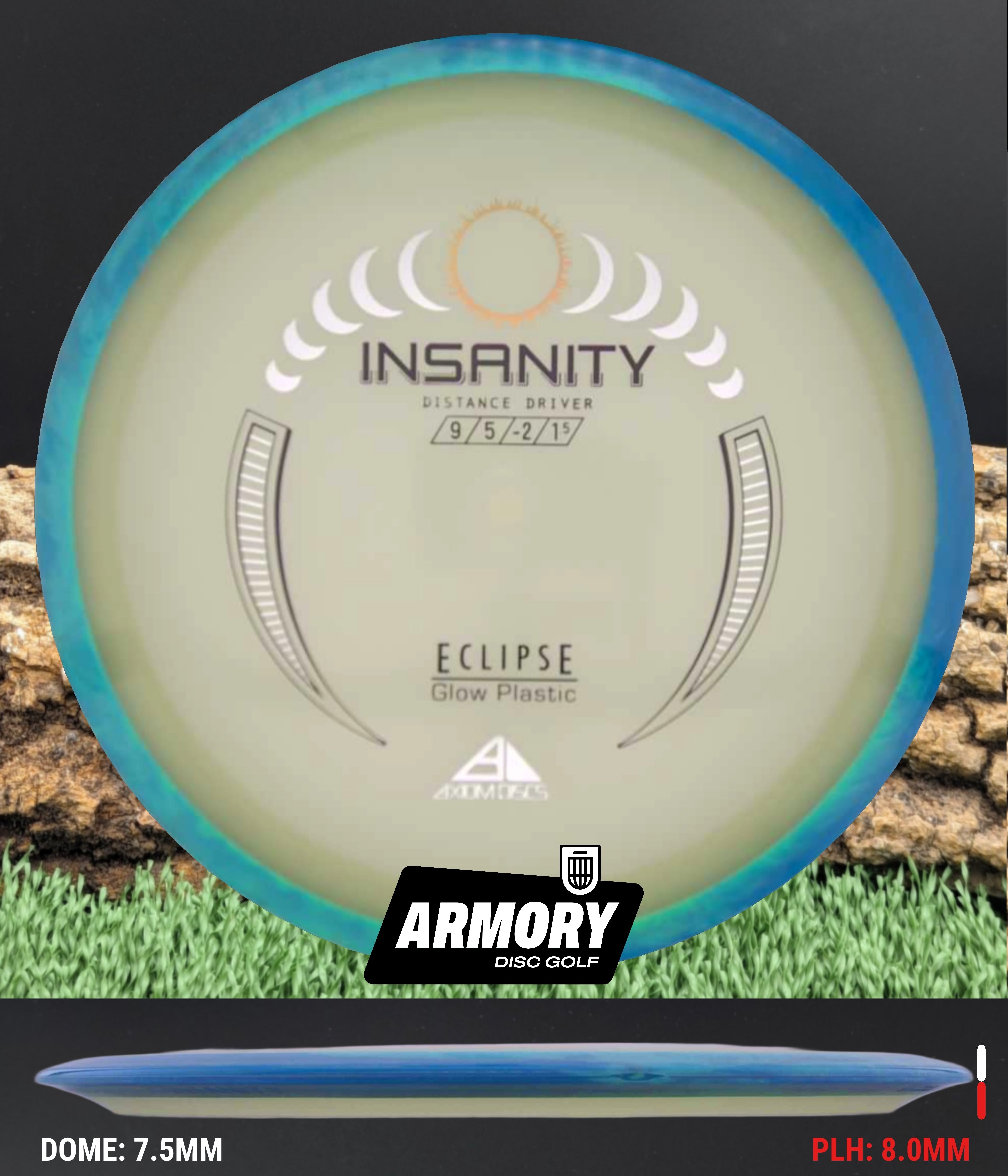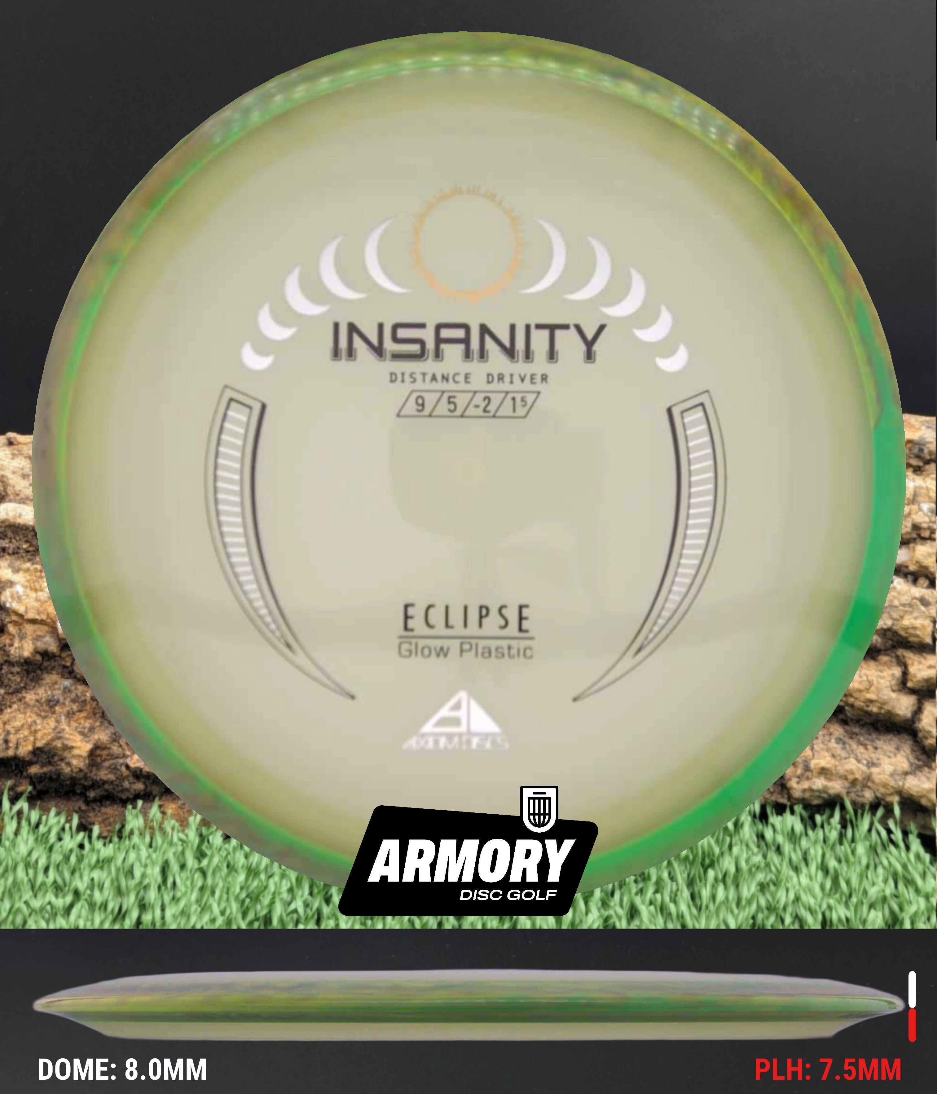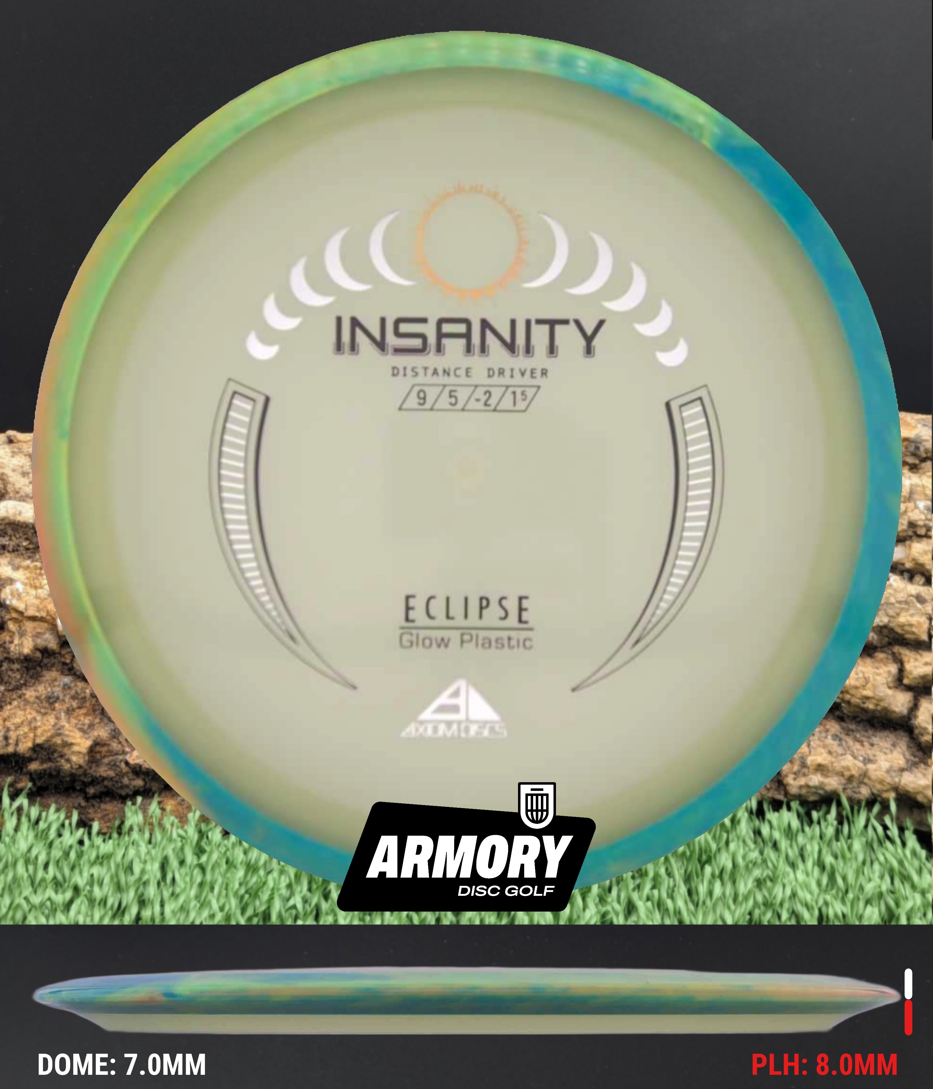 Another Special Edition release (for Halloween of 2021), the Eclipse Insanity is making its absolutely glowing return as a stock offering! Maintaining flight numbers of 9 | 5 | -2 | 1.5, the Eclipse Insanity is now available any time you need a consistent stable to understable distance driver for your bag. High power players will have a precise flip-up or turnover disc for day or night, while average power players will have a remarkably straight distance driver. Designed with a softened profile to mimic a more worn-in disc, explore the multitude of shot shapes the Eclipse Insanity can bring to your game by grabbing your own from your favorite local or online retailer!