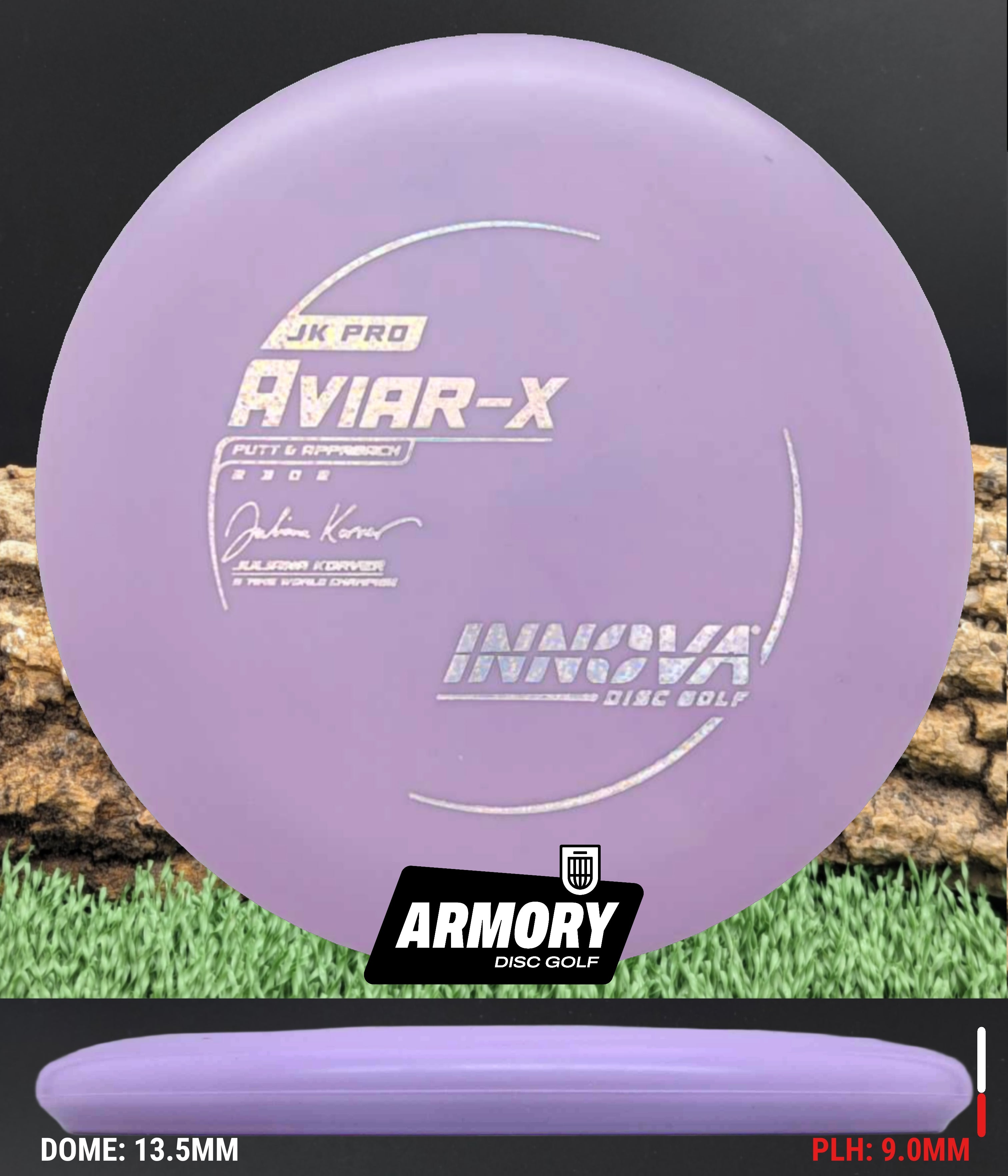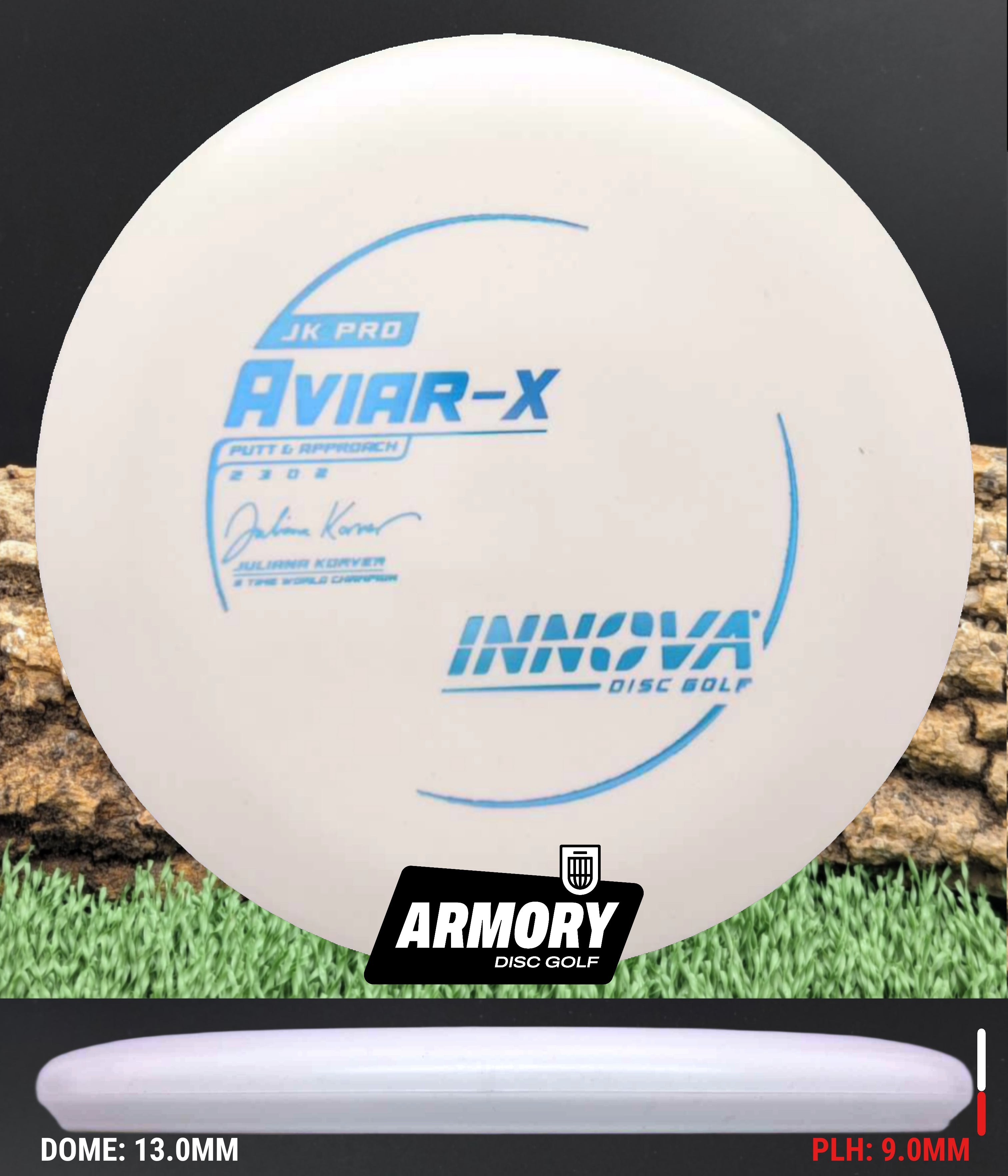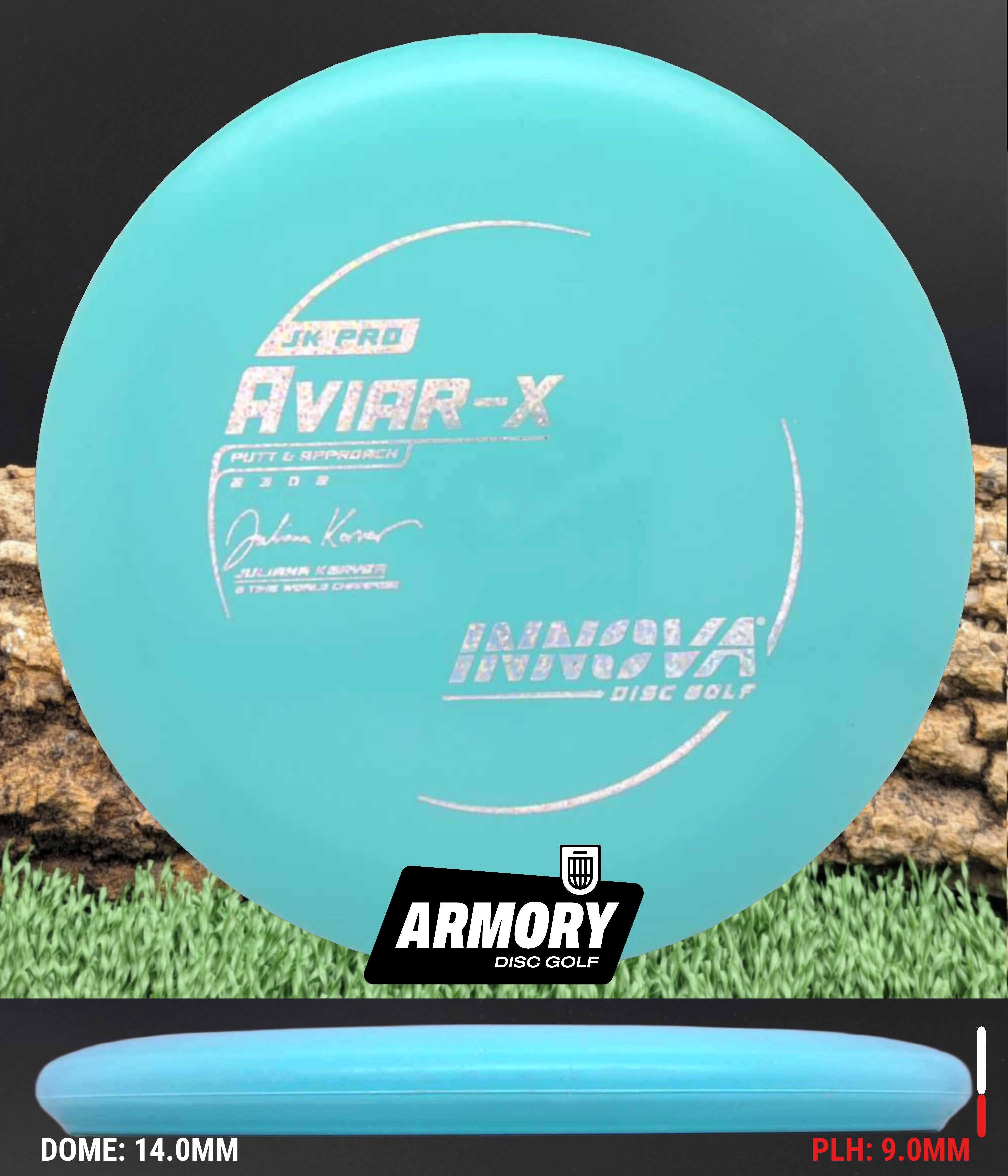 The JK (Juliana Korver) Aviar is made from the driver mold in a special blend of durable Pro-line Plastic that is more flexible and grippier than the other Aviar models. It has the same flight characteristics as the KC Aviar. Its softer plastic is better in colder climates and for those who have dry hands and require a tackier grip.