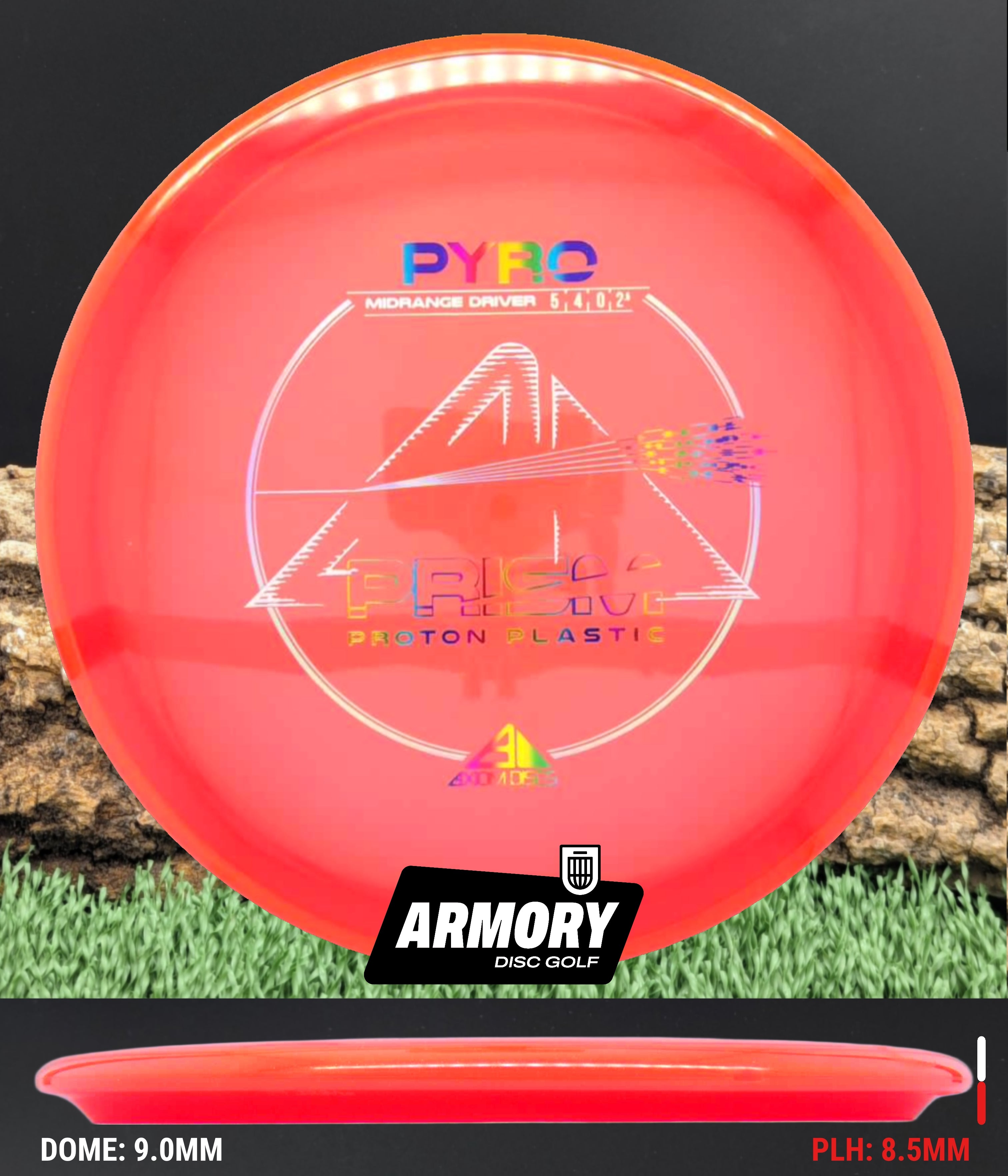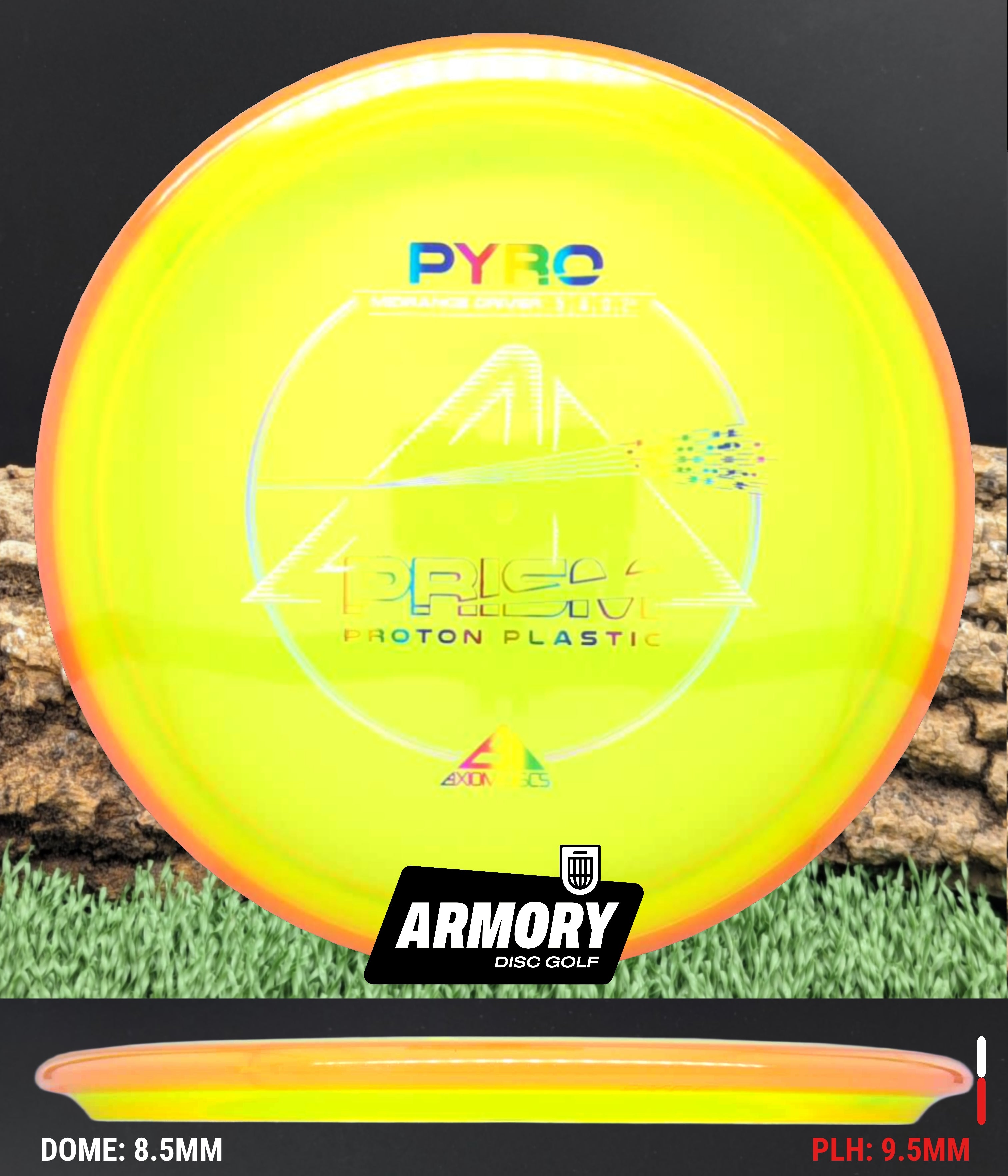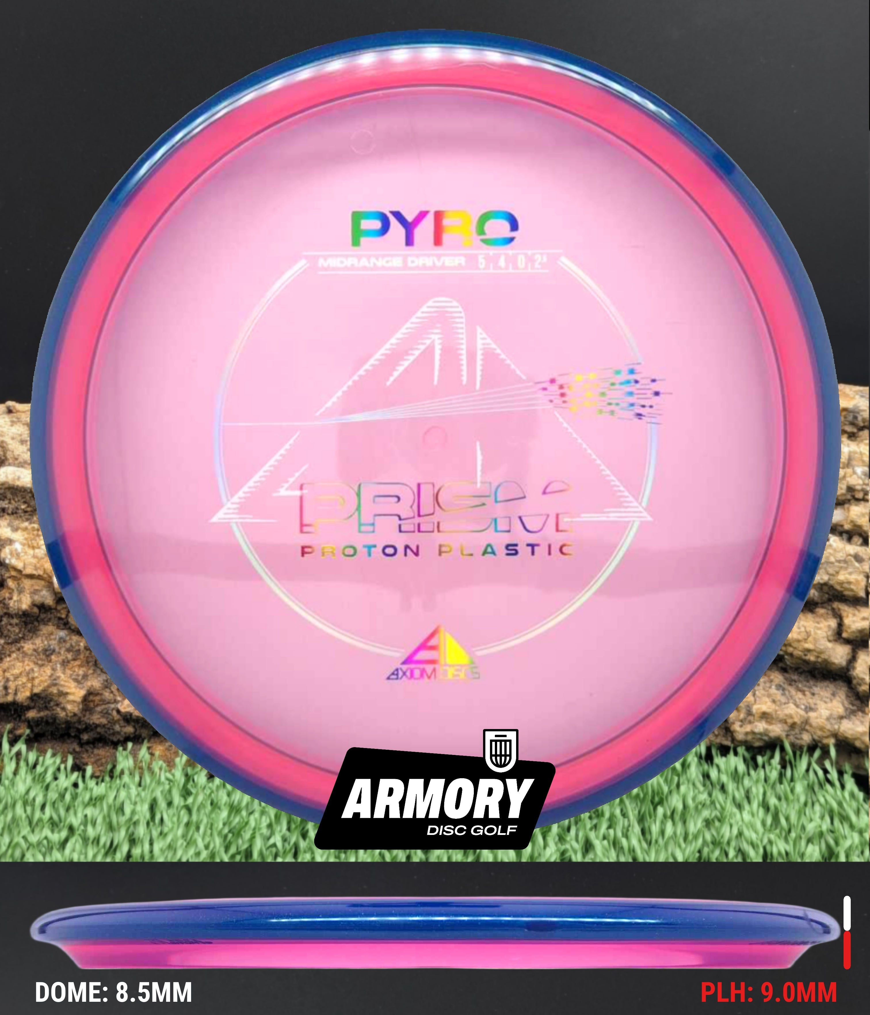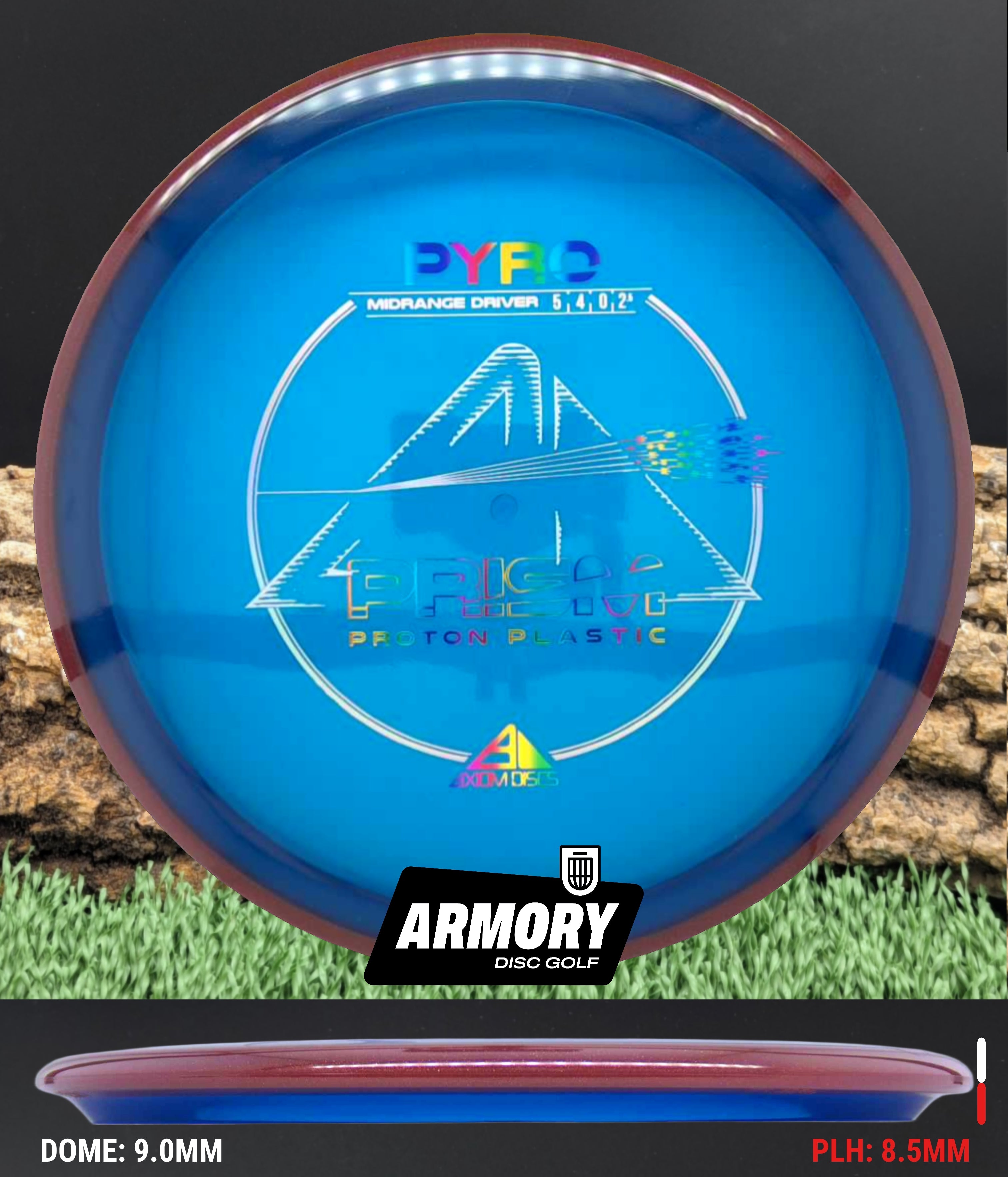 The Axiom Pyro in Prism Proton plastic brings a perfect balance of durability, stability, and visual appeal to one of Axiom’s most trusted midranges. Featuring flight numbers of 5 | 4 | 0 | 2.5, the Pyro offers a reliably overstable flight with dependable fade — ideal for forehands, headwinds, and precise placement shots.