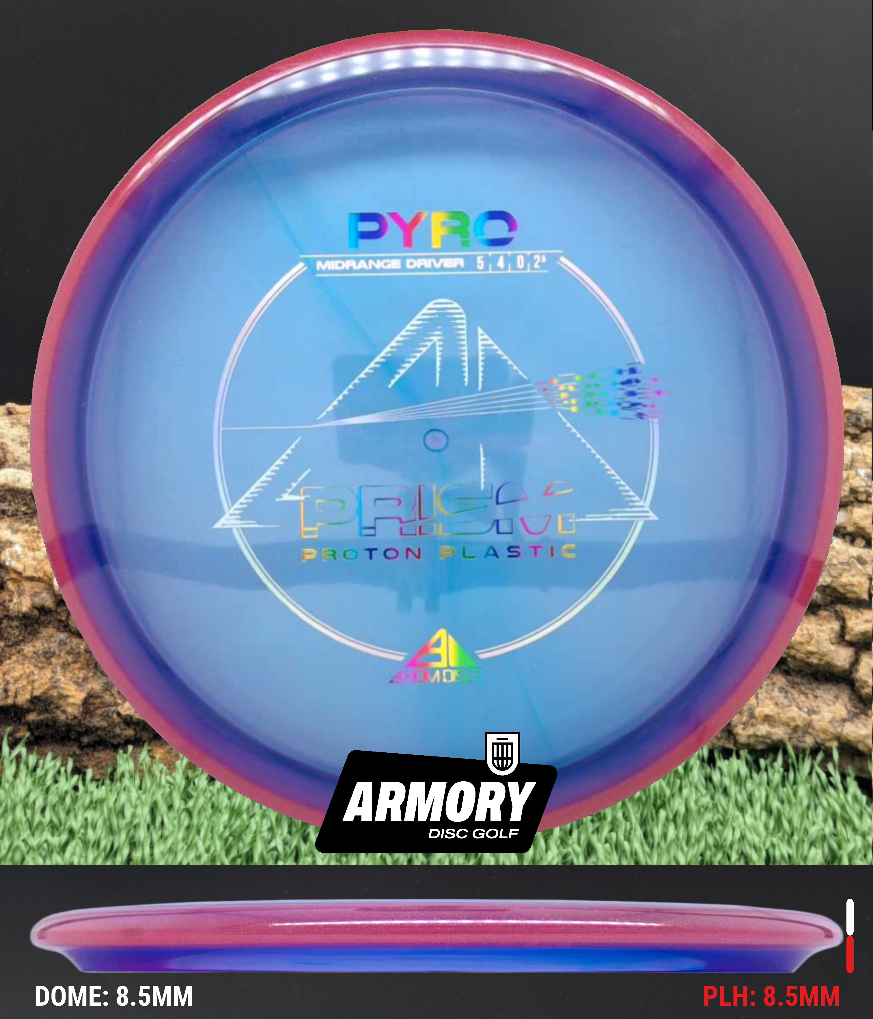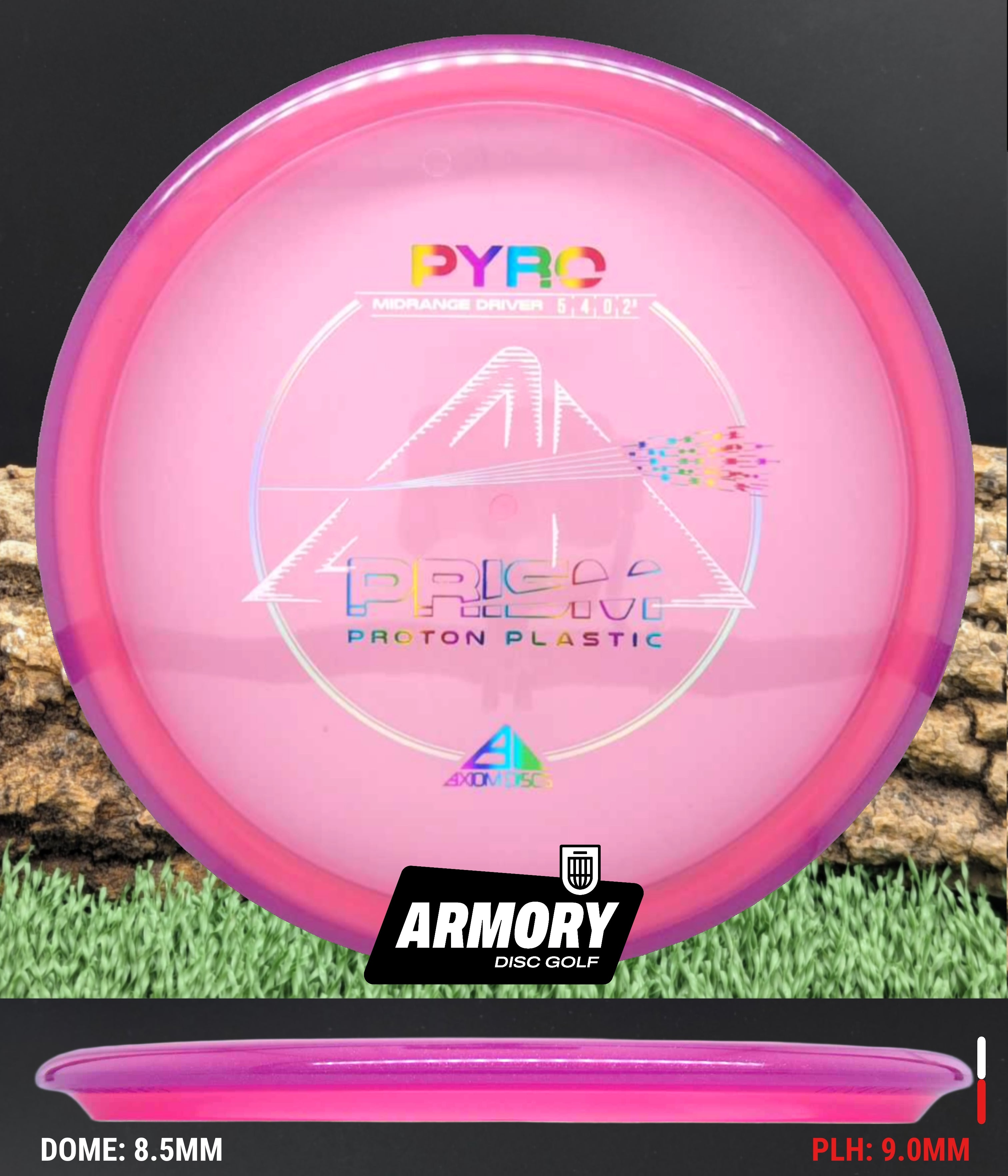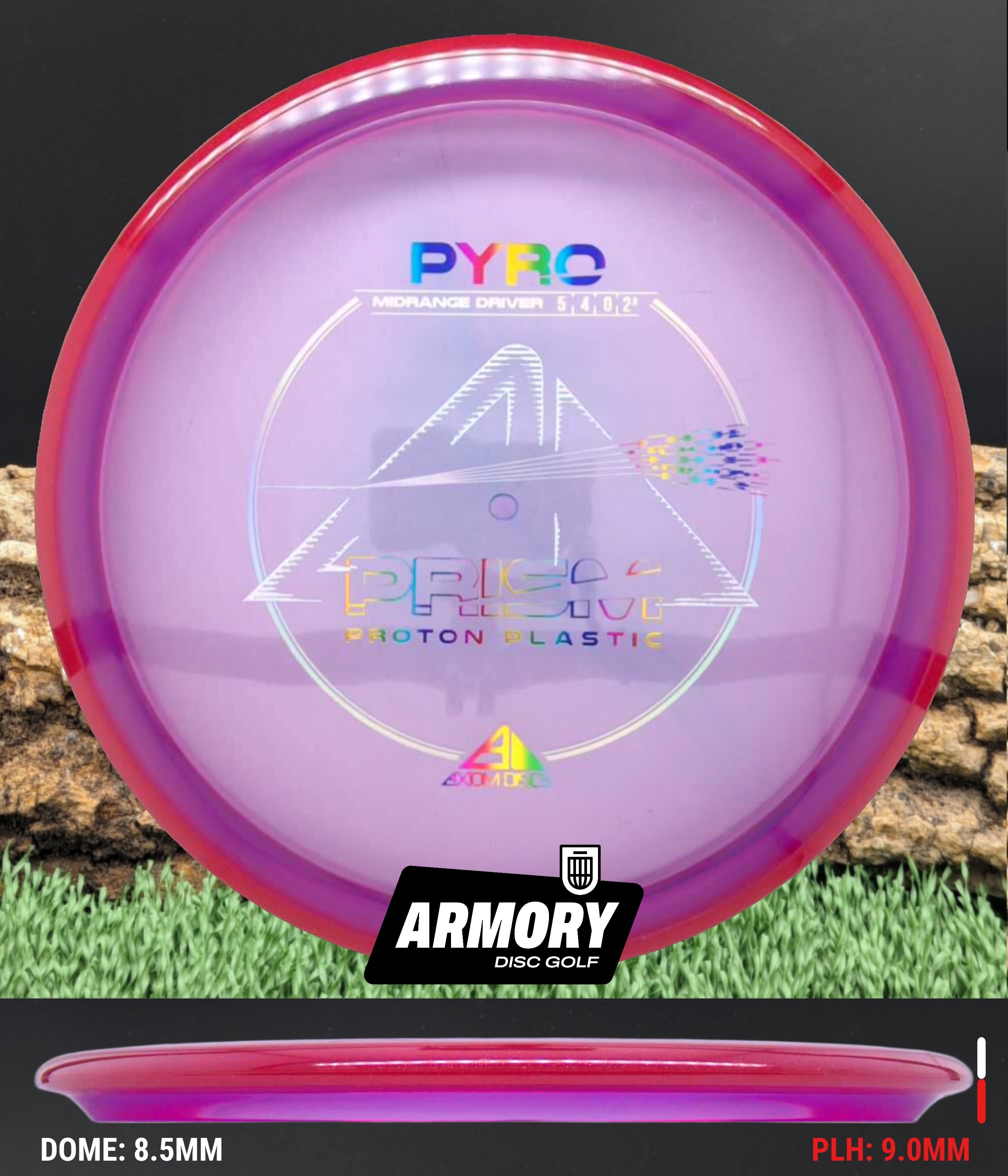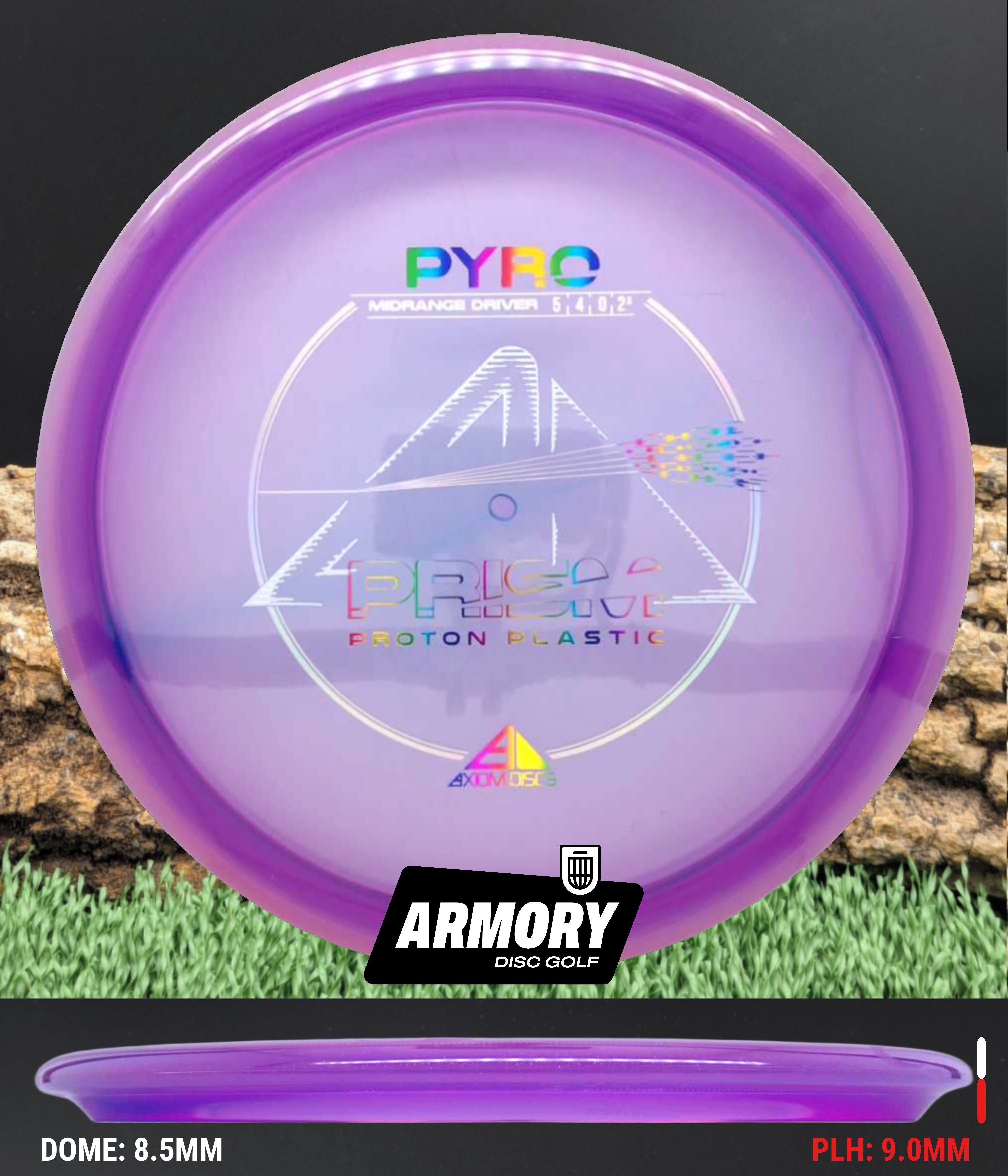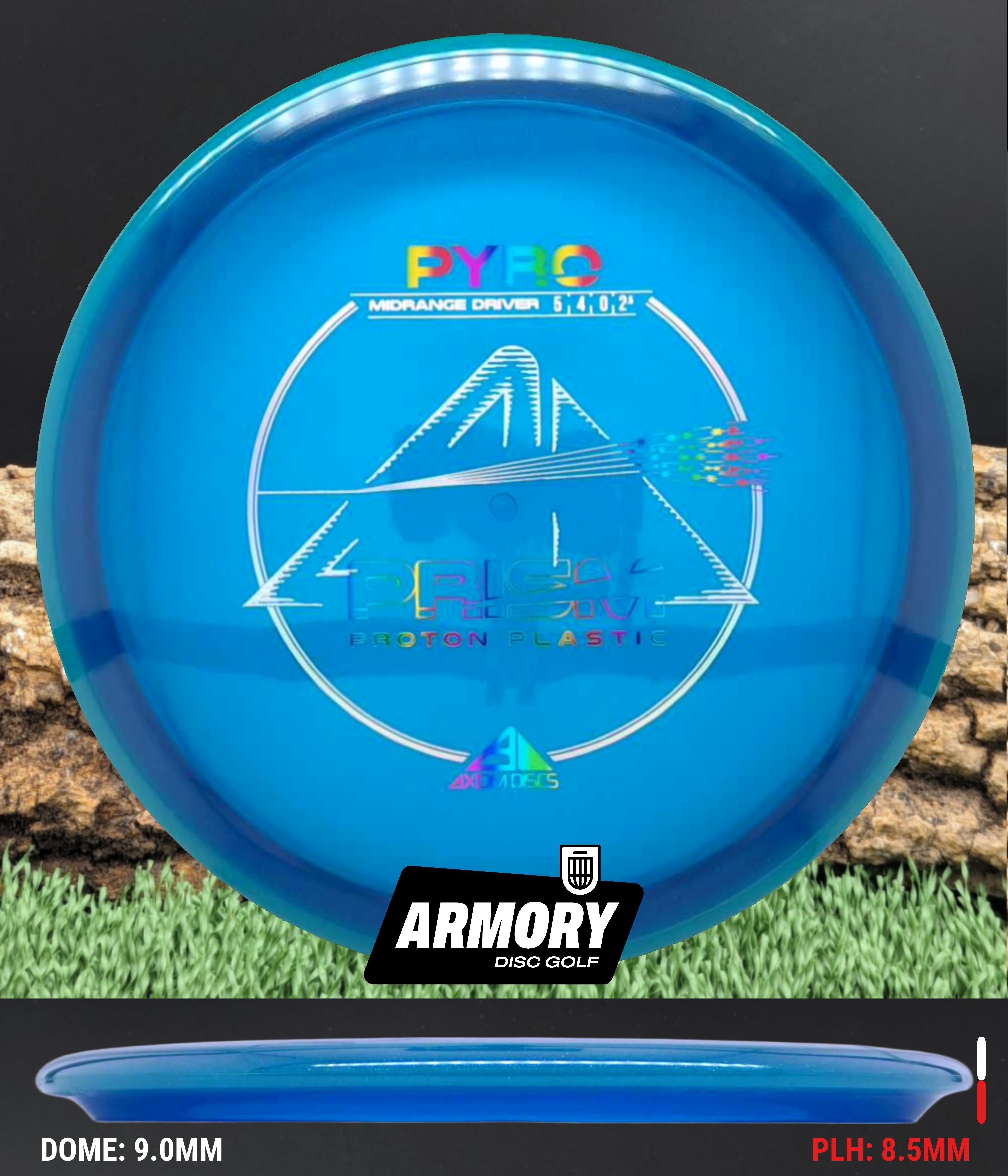 The Axiom Pyro in Prism Proton plastic brings a perfect balance of durability, stability, and visual appeal to one of Axiom’s most trusted midranges. Featuring flight numbers of 5 | 4 | 0 | 2.5, the Pyro offers a reliably overstable flight with dependable fade — ideal for forehands, headwinds, and precise placement shots.