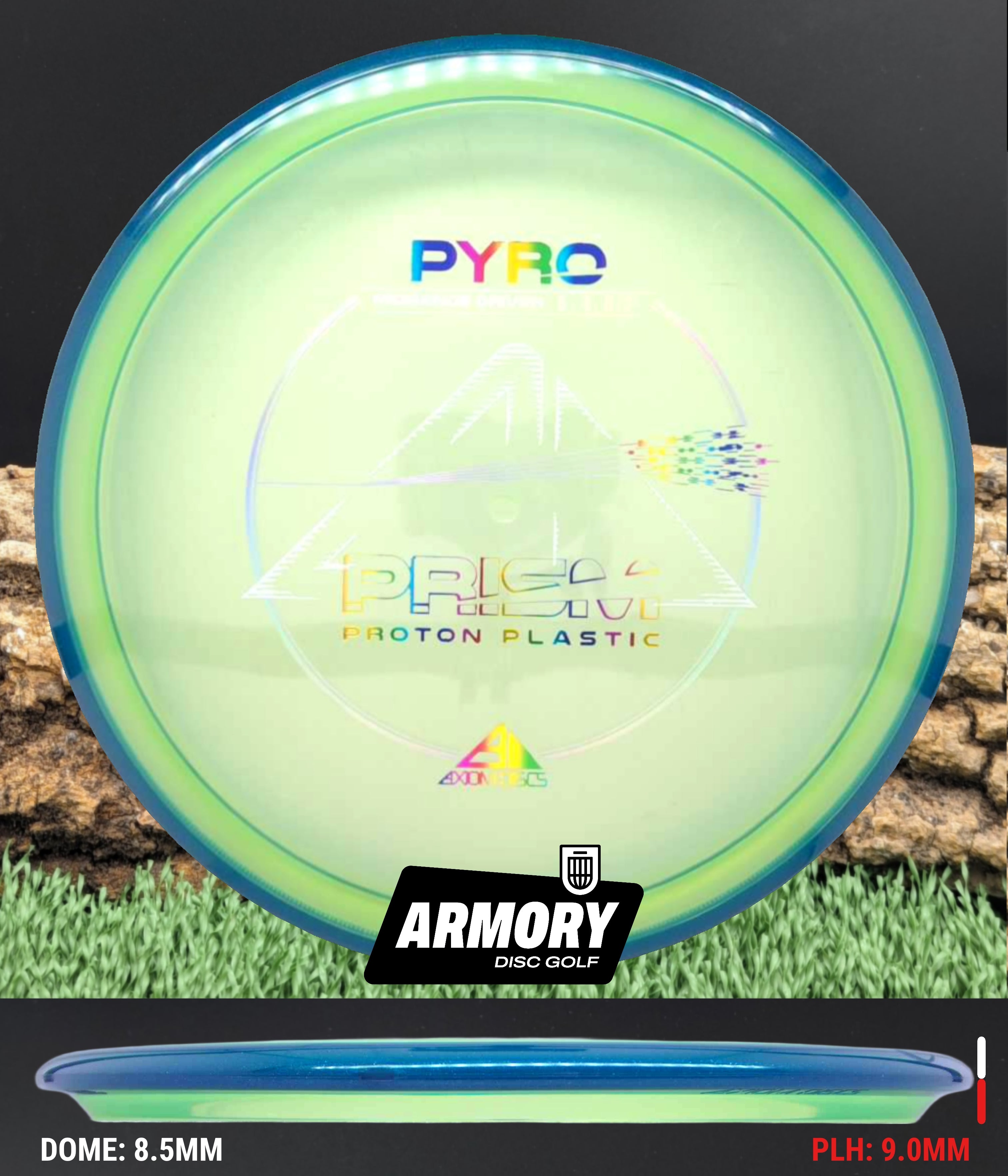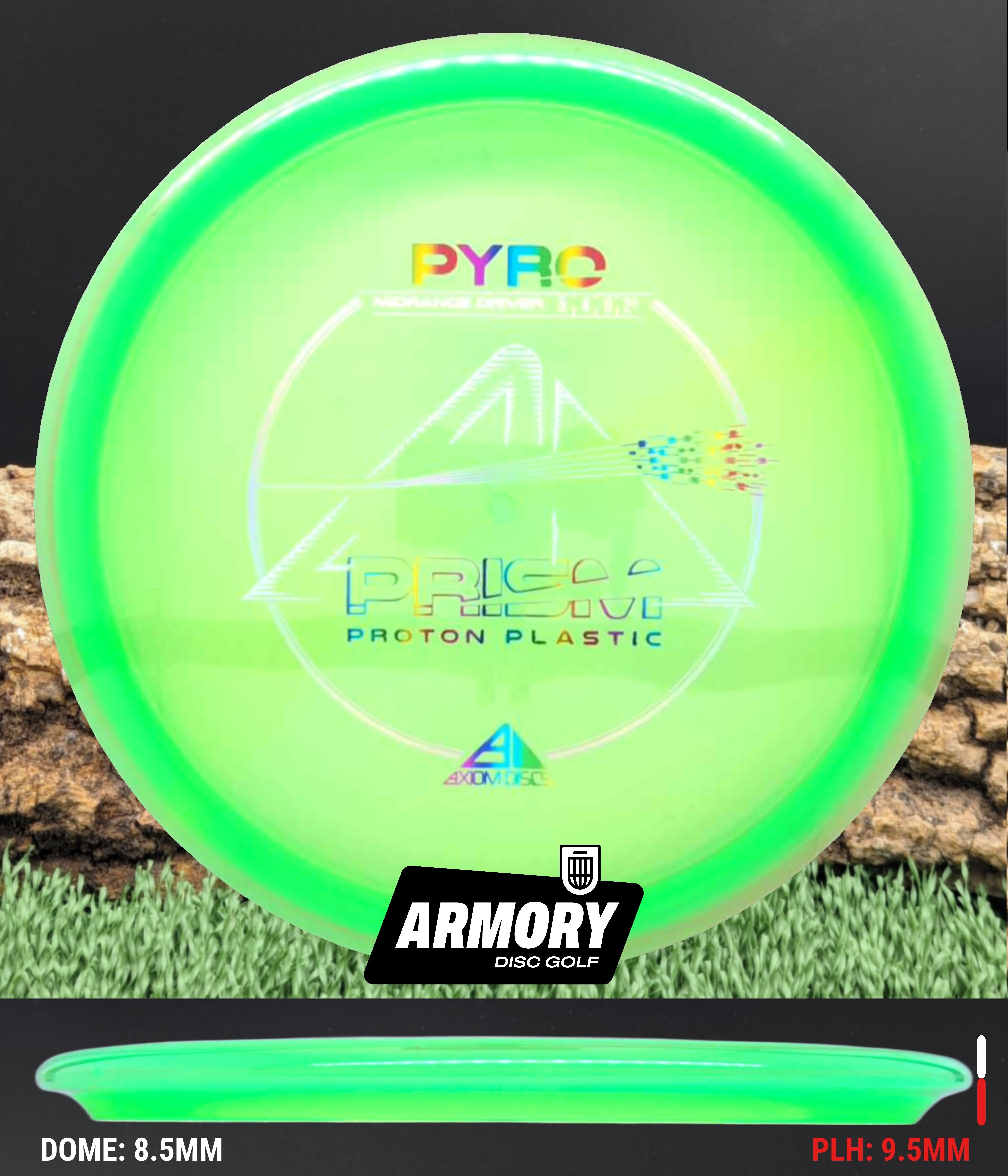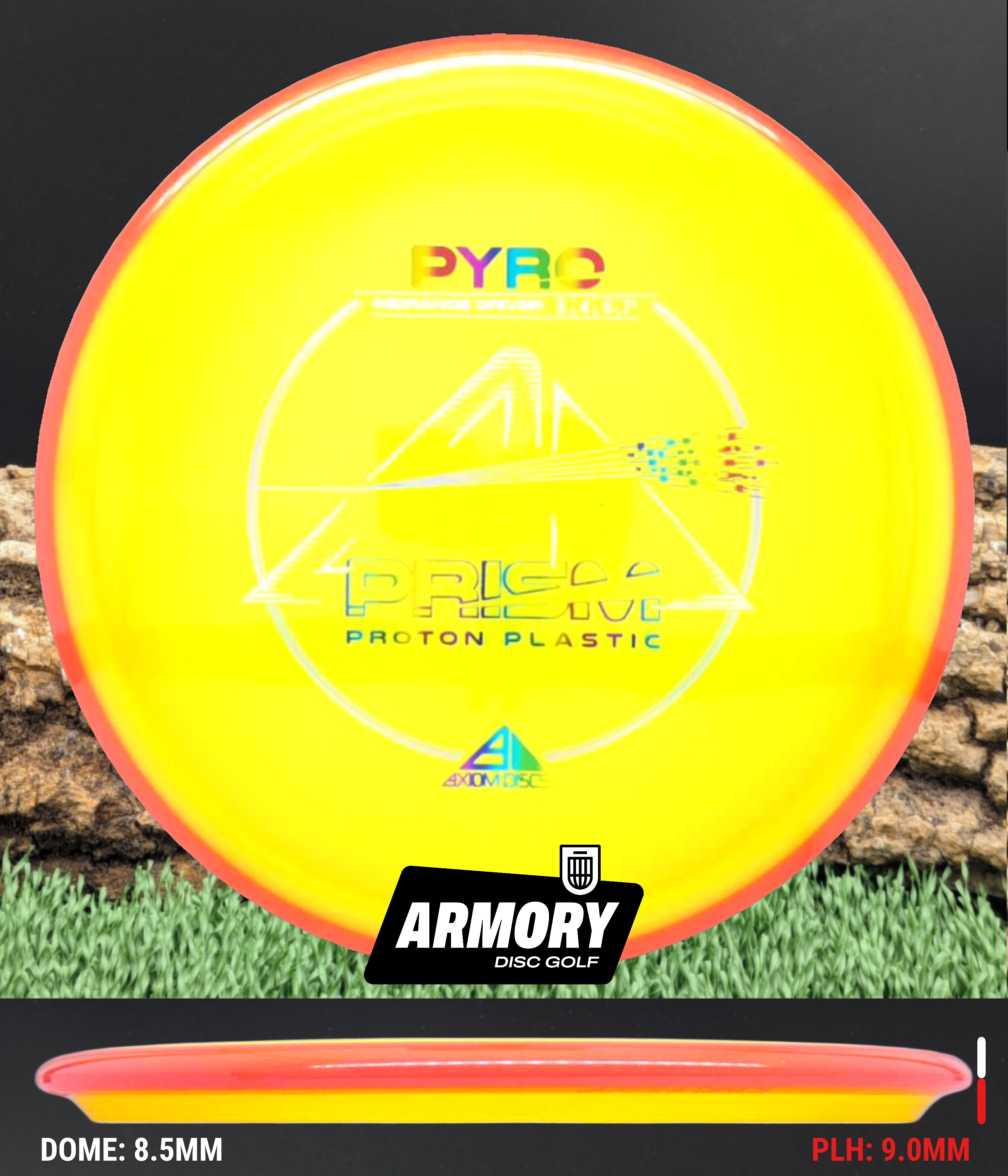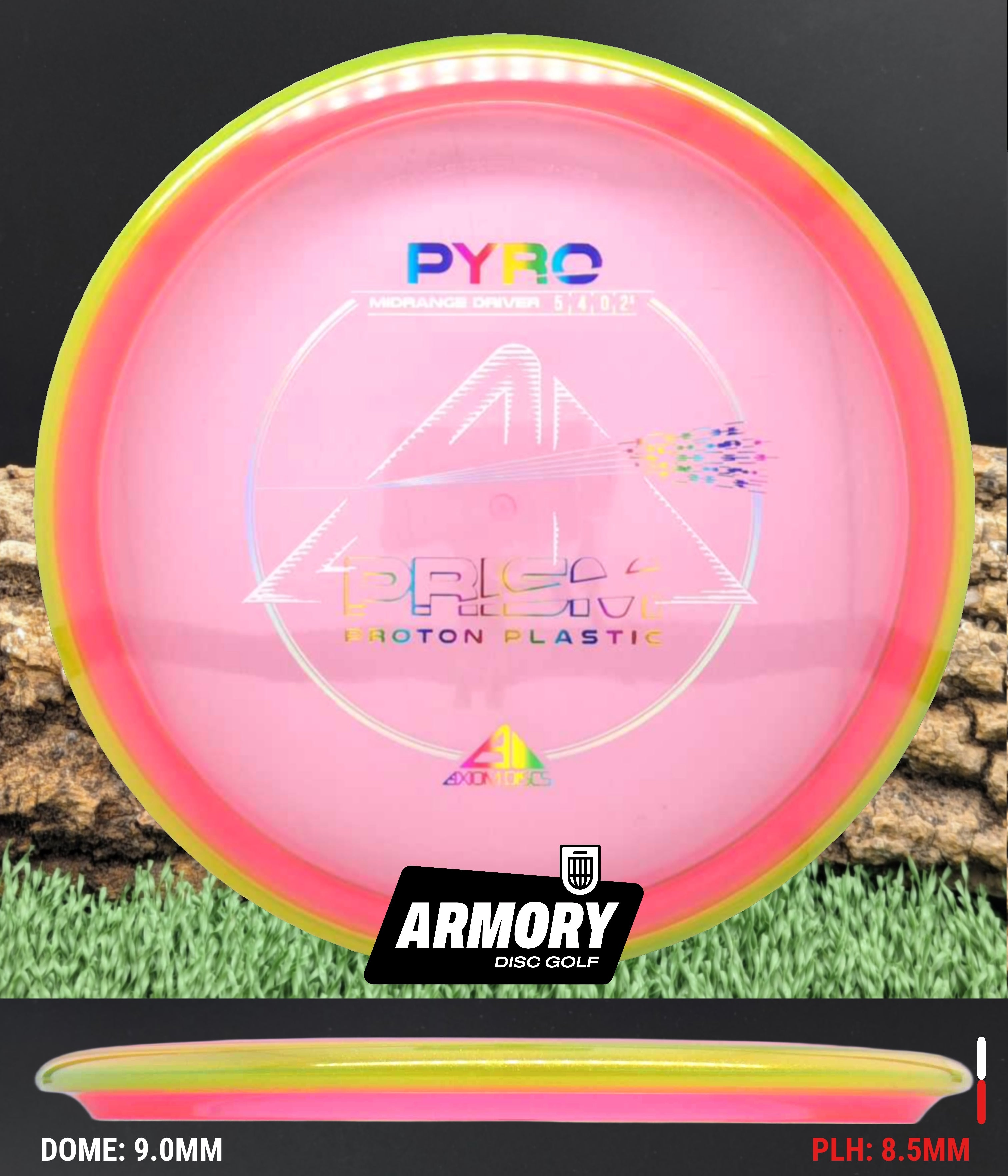 The Axiom Pyro in Prism Proton plastic brings a perfect balance of durability, stability, and visual appeal to one of Axiom’s most trusted midranges. Featuring flight numbers of 5 | 4 | 0 | 2.5, the Pyro offers a reliably overstable flight with dependable fade — ideal for forehands, headwinds, and precise placement shots.