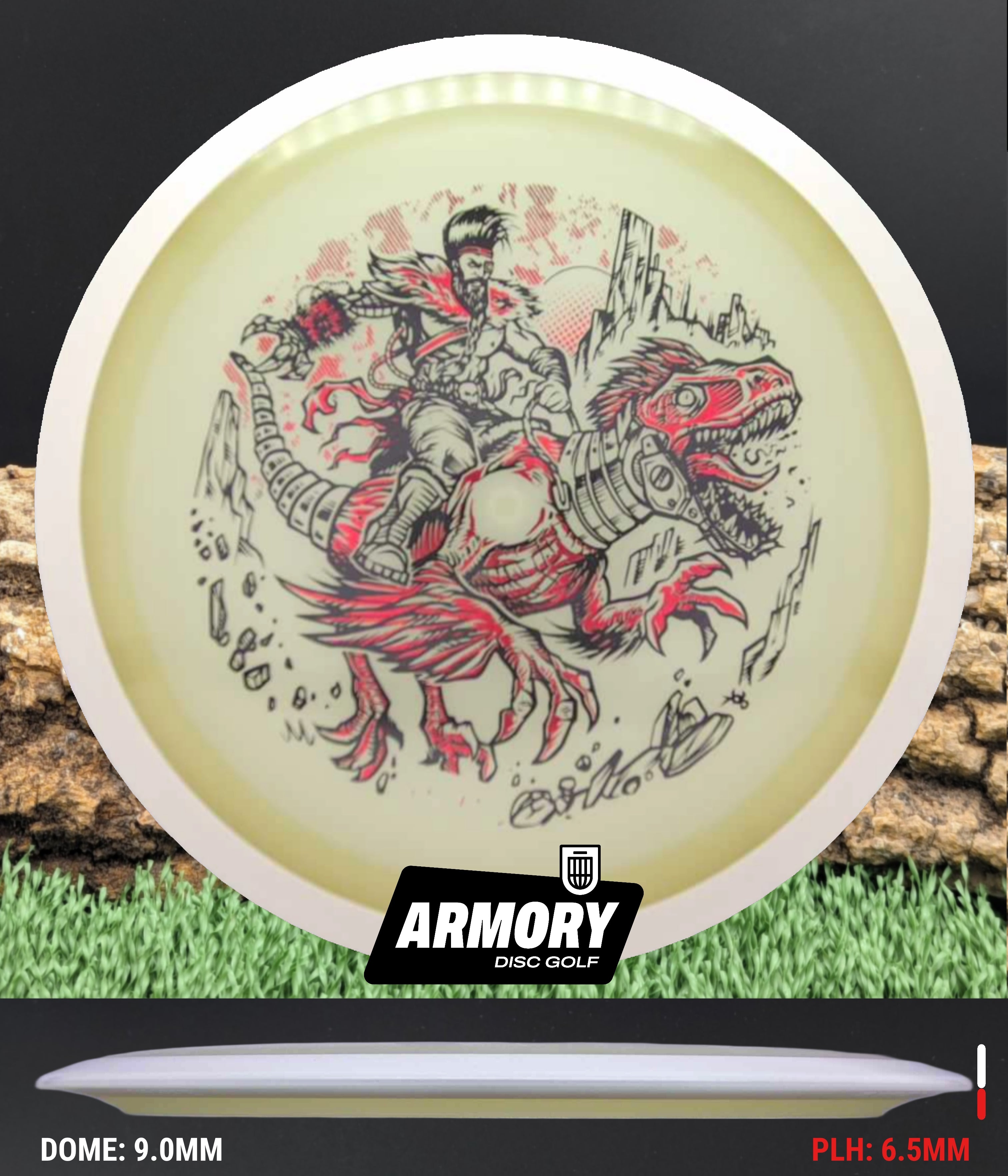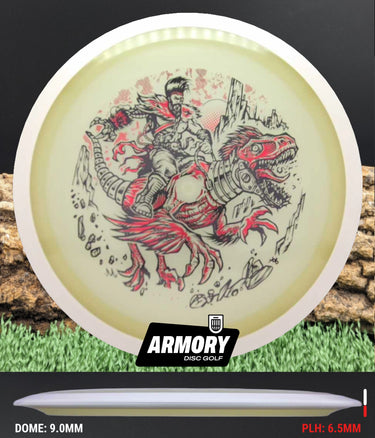 This Warrior Raptor Edition features a bold red accent foil stamp showcasing a futuristic tribal warrior riding a mechanical raptor. The neon foil pairs aggressively with the glow plastic, creating a performance-first driver with strong visual presence.