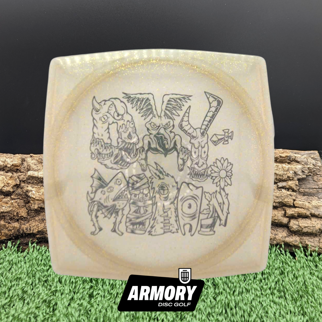 The Doomsday Discs Oxymoron is a twisted experiment in disc design, created purely for entertainment and casual rounds. Unlike traditional discs, the Oxymoron features a square outer shape, making it intentionally non-PDGA approved and unapologetically unconventional.