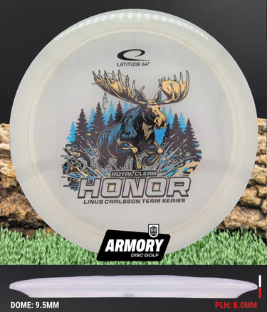 The Latitude 64 Honor - Linus Carlsson 2026 Team Series in Royal Clear plastic is a control-focused fairway driver built for precision, glide, and dependable overstability. The Latitude 64 Honor delivers a stable to overstable flight with minimal turn and a strong, reliable finish, making it a trusted option for accurate tee shots and controlled fairway placement. It is designed for players who want a driver that holds its line and finishes with confidence.