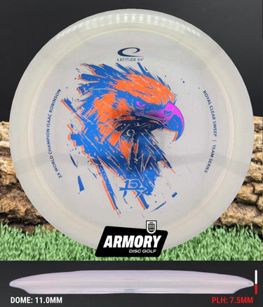 The Latitude 64 Sweep - Isaac Robinson Team Series in Royal Clear plastic is a versatile fairway driver built for smooth control, glide, and dependable distance. The Latitude 64 Sweep offers a stable flight with slight turn and a reliable finish, allowing it to hold lines with confidence whether thrown flat or on hyzer. With its balanced flight and strong glide, the Latitude 64 Sweep excels as a go-to fairway driver for shaping controlled shots.